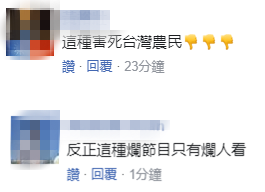还有人表示,“反正这种烂节目只有烂人看”“这种害死台湾农民”。