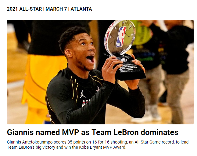 北京时间3月8日,2021年NBA全明星赛在亚特兰大上演,勒布朗队一路领先,最终以170比150大胜杜兰特队。其中,勒布朗队的字母哥安特托昆博16投16中得到35分7篮板,获得科比·布莱恩特MVP奖杯。
