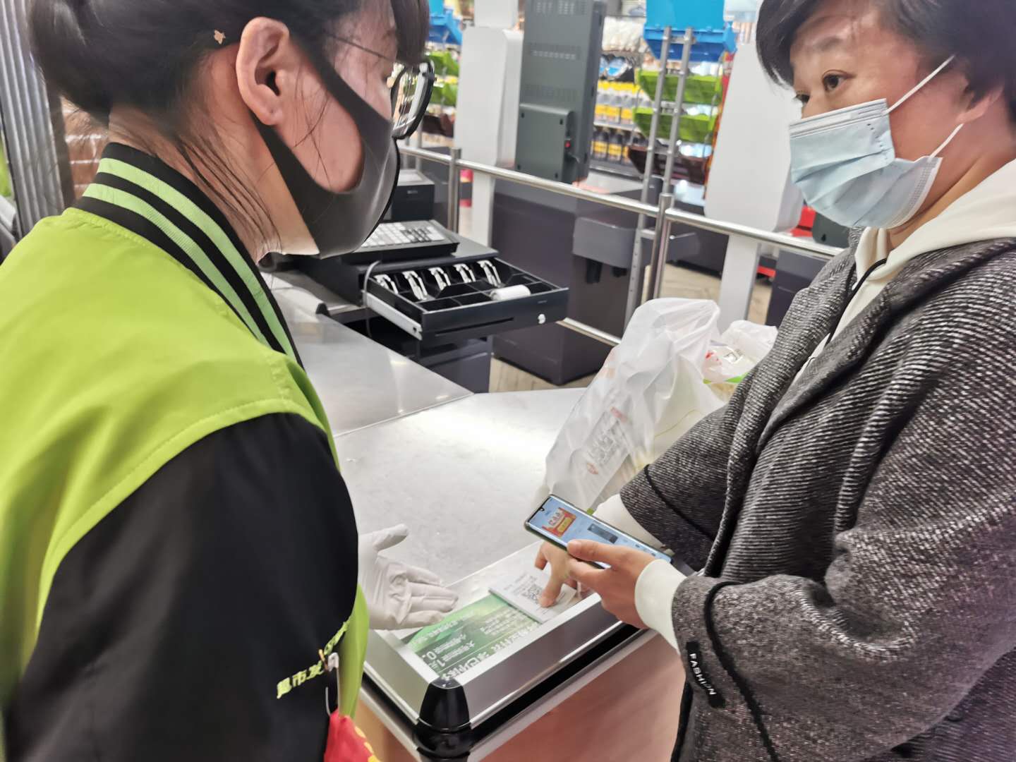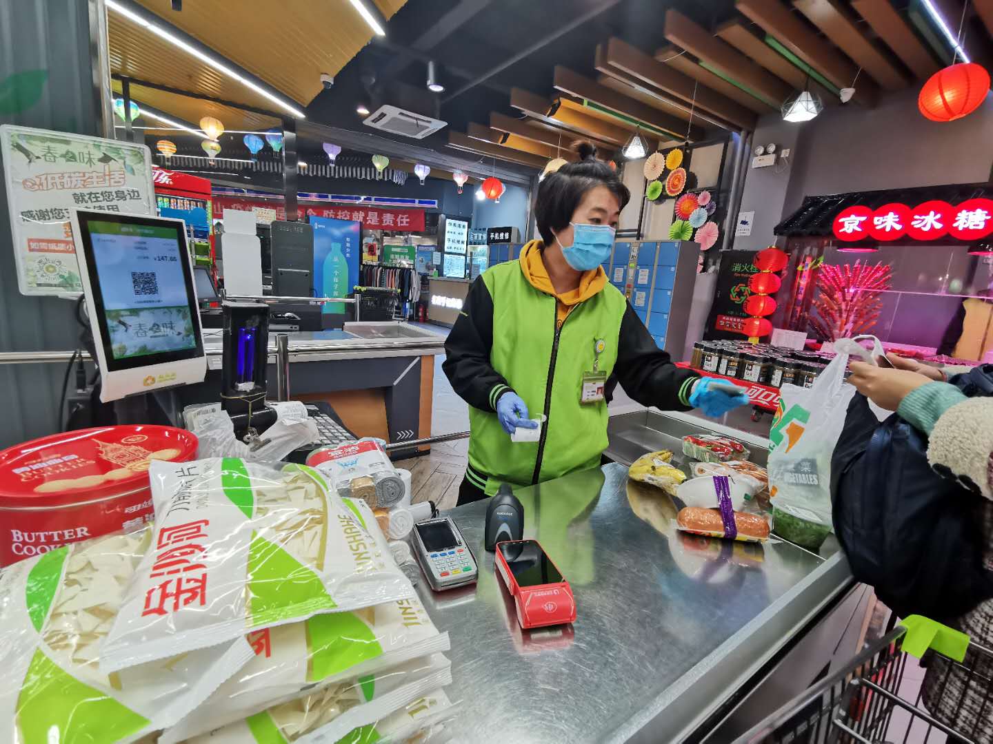 与此同时,收银台上还新增面对消费者的智能显示屏,在结账时,消费者可以清晰看到购物信息,显示屏上会出现二维码,并发出语音提示,顾客可扫描屏幕上的二维码获取数字小票。