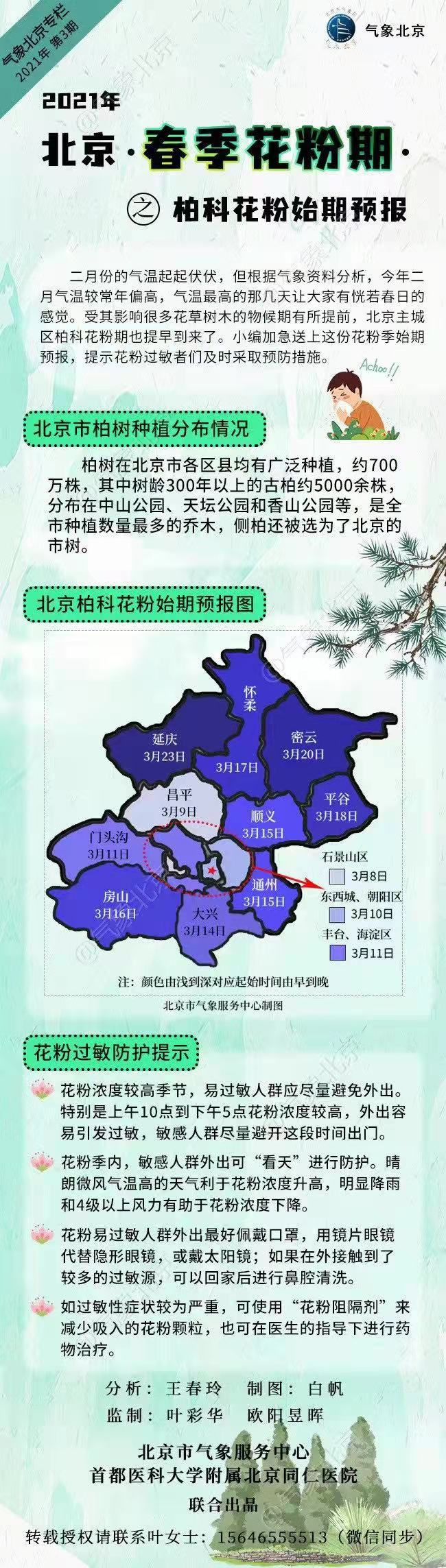 另外,“花粉监测预报”公众号今天就将推出最新的“北京柏科花粉始期预报”,请市民及时关注。