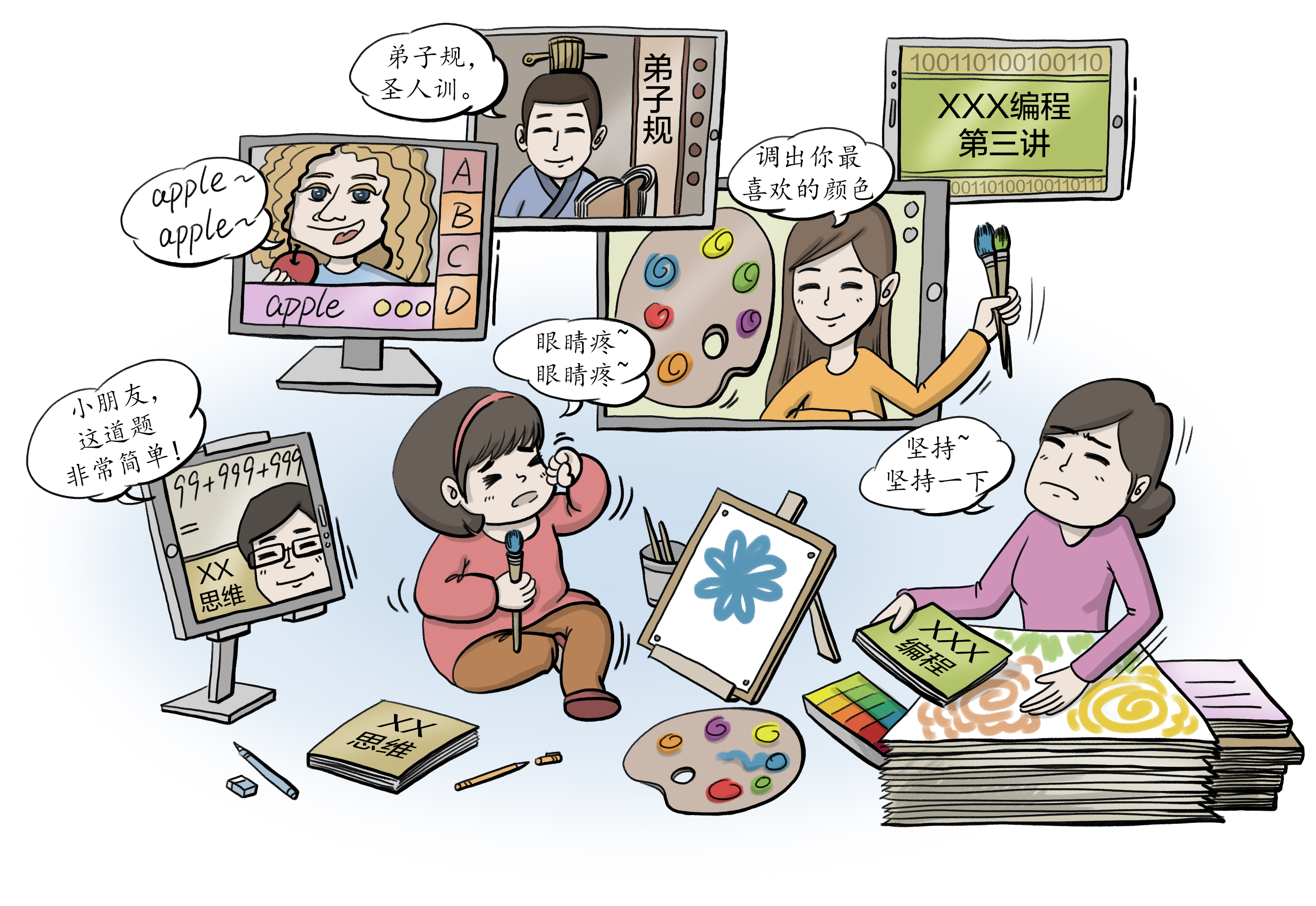 周末,田静发现一向乖巧好学的儿子闹起了情绪,抱怨自己课太多。“我们仔细一盘算,发现还真是个问题。之前总觉得每节课也就15分钟左右,可不知不觉越报越多,现在每周语数外三门加起来就有15节,另外还有2节编程课,2节口语课,如果再报美术,眼看就要突破20节,对5岁孩子来说,总时长确实有点难以承受。”
