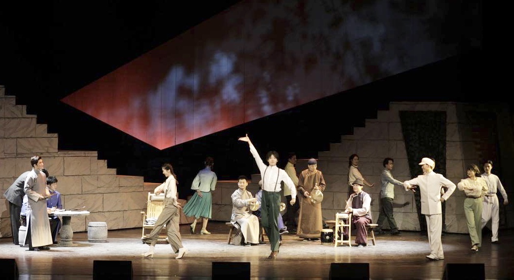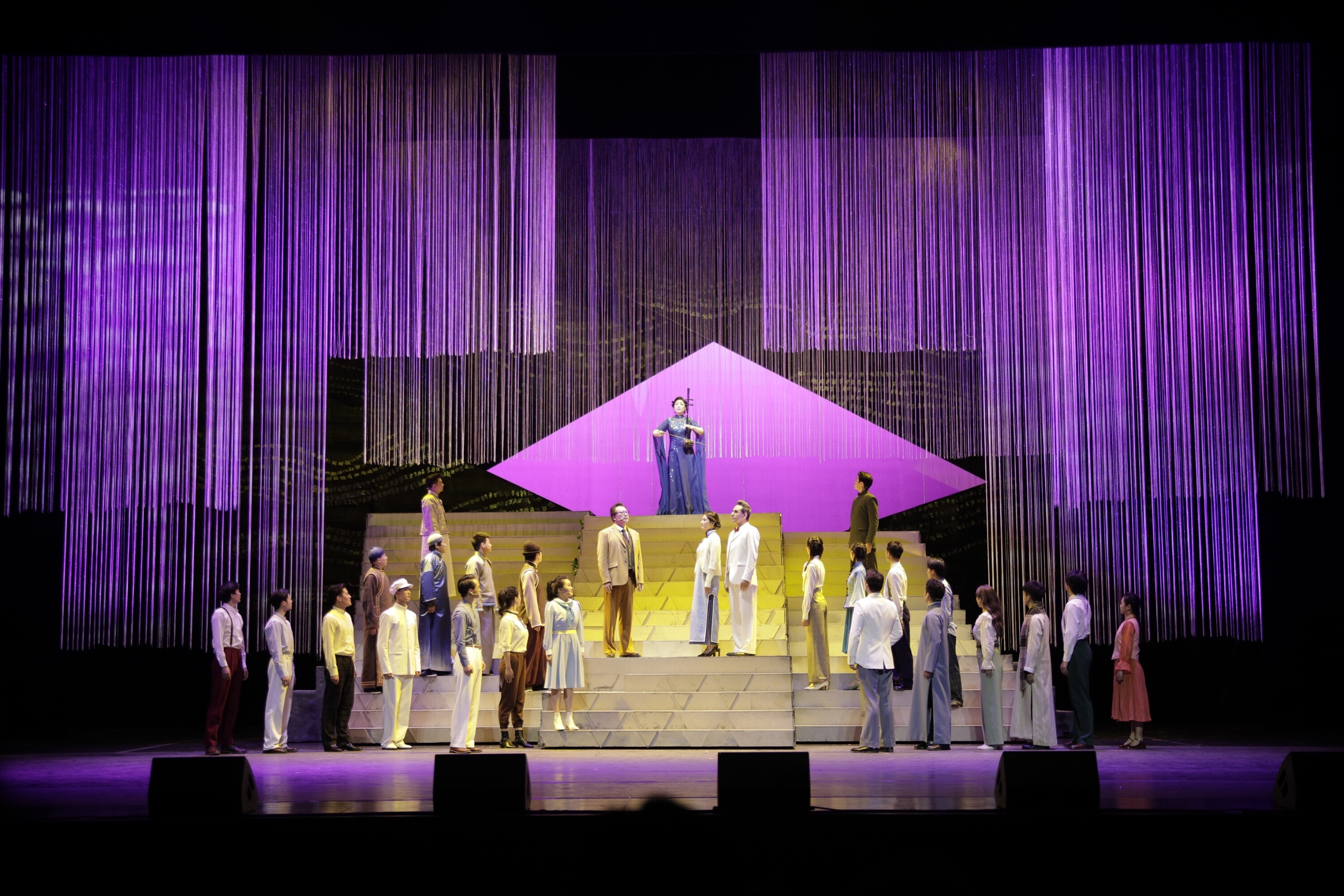 一曲明亮的二胡声拉开了《刘天华》的大幕,音乐剧以时空对话的形式展开,宋飞的身影出现在舞台之上。宋飞是刘天华的第三代传人,此番变身音乐剧演员,她坐在舞台高处,与舞台前侧的演员呼应,共同讲述前辈艺术家的故事。