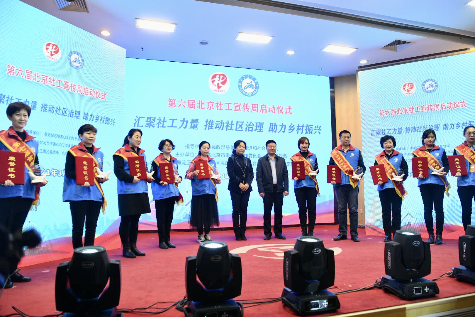 本届“北京社工宣传周”活动由市委社会工委市民政局主办,主题为“汇聚社工力量,推动社区治理,助力乡村振兴”。启动仪式上,主办方揭晓了“首都最美社工”、“首都优秀社工”、“优秀社工机构”等奖项,并对芦晓静等10名“首都最美社工”、冯杰等20名“首都优秀社工”、东城区助人社会工作事务所等10个“优秀社工机构”进行了表彰。