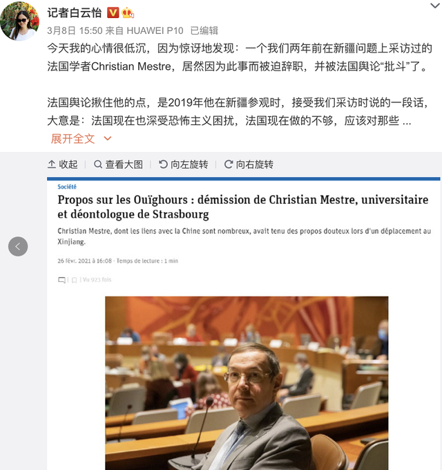 △2019年曾采访梅斯特的中国记者白云怡发文