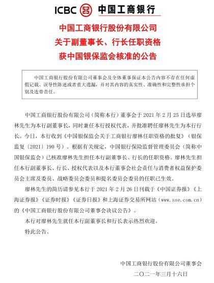 3月16日,工行发布公告称,该行收到《中国银保监会关于工商银行廖林任职资格的批复》(银保监复〔2021〕190号)。根据有关规定,银保监会已核准廖林担任该行副董事长、行长的任职资格。廖林担任工行副董事长、行长、授权代表以及该行董事会社会责任与消费者权益保护委员会主席及委员、战略委员会委员和提名委员会委员的任职已生效。