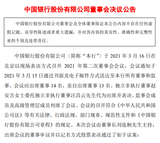 中国银行发布公告称,3月16日在北京以现场表决方式召开2021 年第二次董事会会议,会议表决通过了聘任刘金为行长的议案,并选举刘金为中行副董事长;会议同时聘任陈怀宇为中行副行长。刘金担任中行行长及陈怀宇担任中行副行长的任职资格待中国银保监会核准。