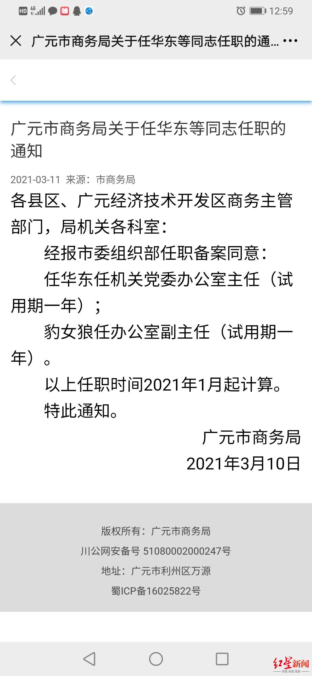 3月10日,四川广元市商务局发布了一份人事任命:任华东任机关党委办公室主任(试用期一年);豹女狼任办公室副主任(试用期一年)。