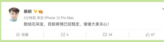 蔡明回应深夜被紧急送医一事:胆结石突发,目前病情已经稳定,谢谢大家关心!