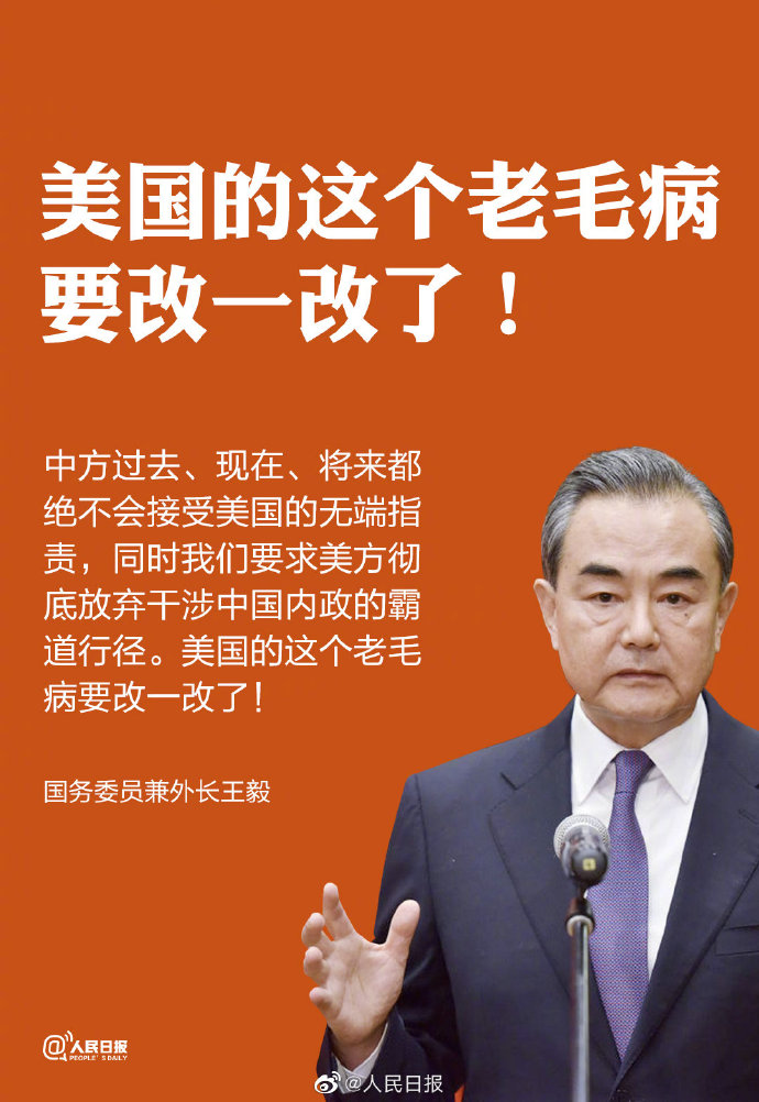 王毅:中方过去、现在、将来都绝不会接受美国的无端指责,同时我们要求美方彻底放弃干涉中国内政的霸道行径。美国的这个老毛病要改一改了!3月17日,美国在香港问题上再次升级对中国的所谓制裁。美方在中方即将动身赴美参加中美高层战略对话前夕出台这一举措,这不是正常的待客之道。如果美方想以此增强所谓对华优势的话,那完全是打错了算盘,恰恰暴露了内心的虚弱和无力。这种做法丝毫不会影响中方的正当立场,也丝毫不会动摇中国人民维护主权和尊严的坚定意志。