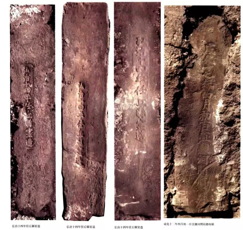 调查走访中,考古工作者在静海区文化馆、静海区教育博物馆等处找到部分采集于张官屯窑址的铭文城砖。“这些铭文砖宽22厘米至24厘米、厚9厘米至11厘米,侧面压印竖行铭文,经辨识有‘成化十七年六月初一日静……’‘……日河间府静海縣’‘九年静海縣窯造’‘成化十九年任丘縣’等。”尹承龙介绍,在张官屯窑址采集到的城砖,规格与北京明代城砖相同,在明代北京营建用砖中,也发现了许多类似的铭文。