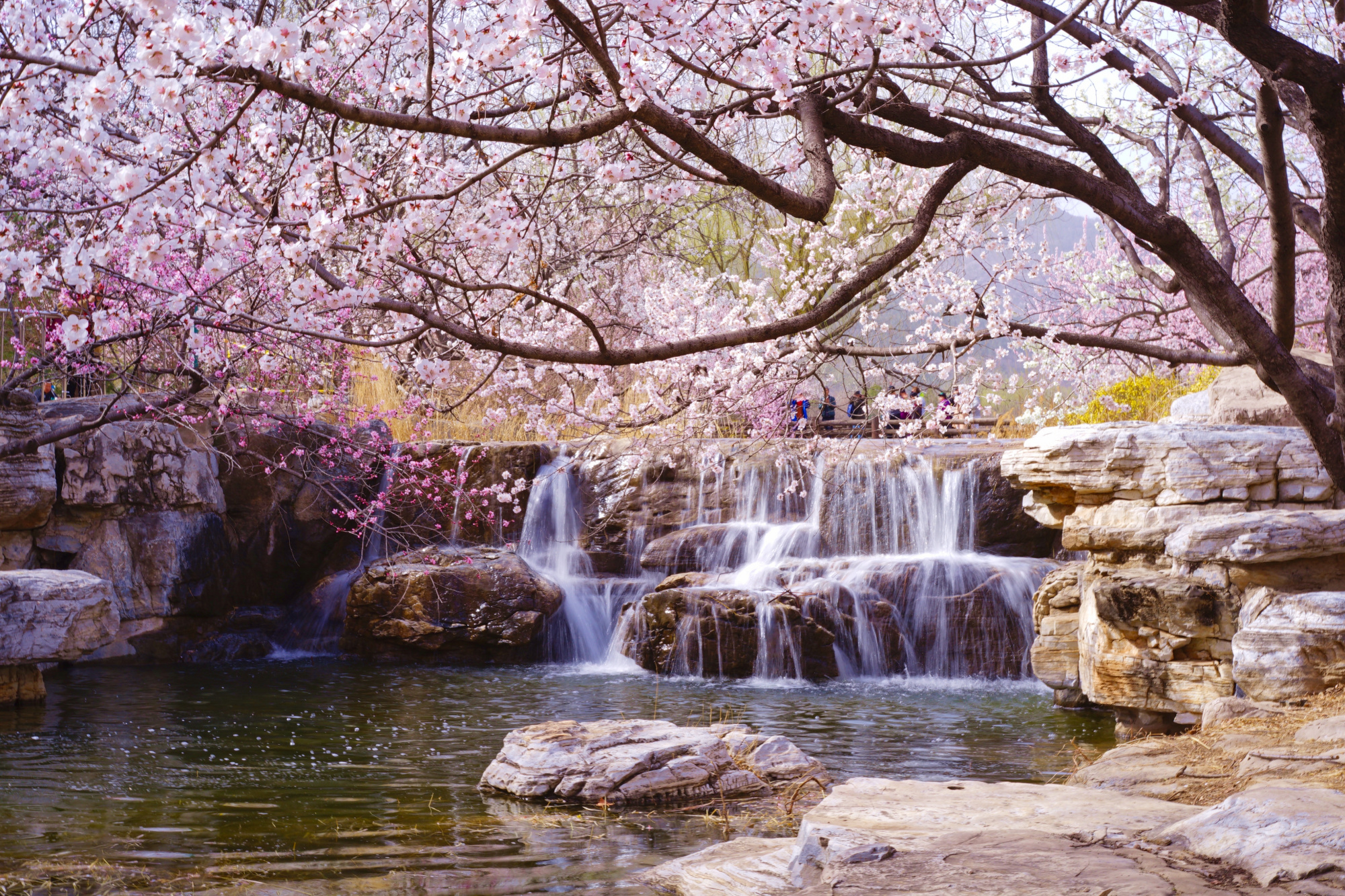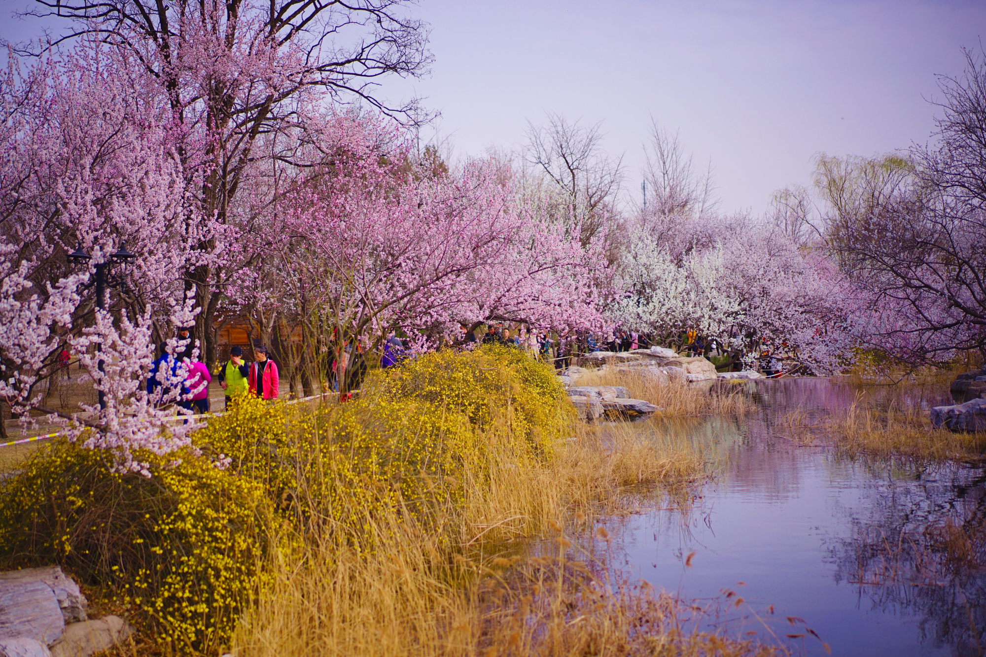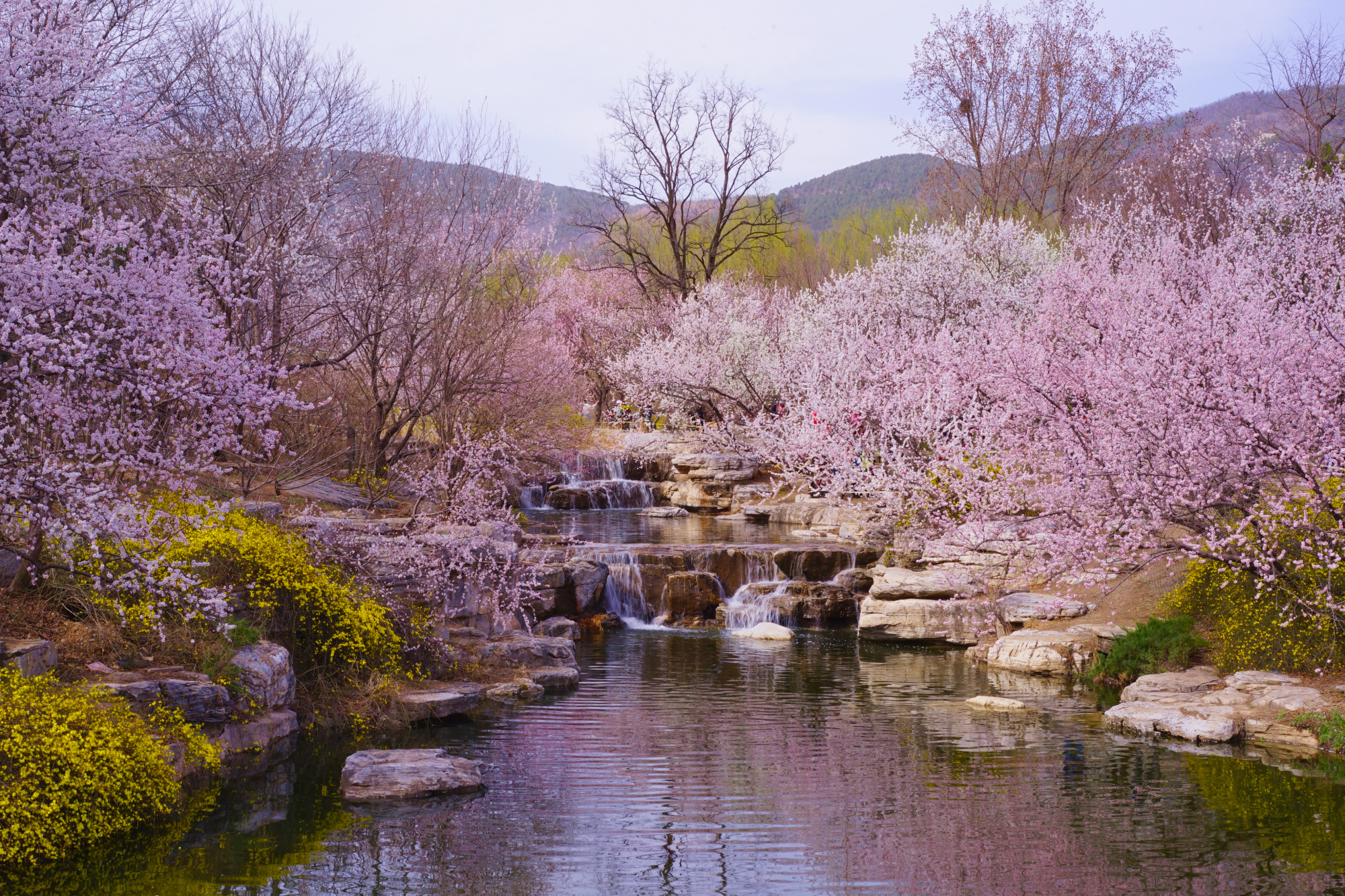 此时位于曹雪芹纪念馆西侧的山桃花溪已经进入最佳观赏期,在这里青山环绕,碧水涟涟,数百株或粉或白的山桃花灼灼开放,黄色的迎春花点缀其间,绘就一幅优美的春日画卷,吸引了不少游客来此踏青赏景。预计山桃花溪观赏期将持续一周左右。