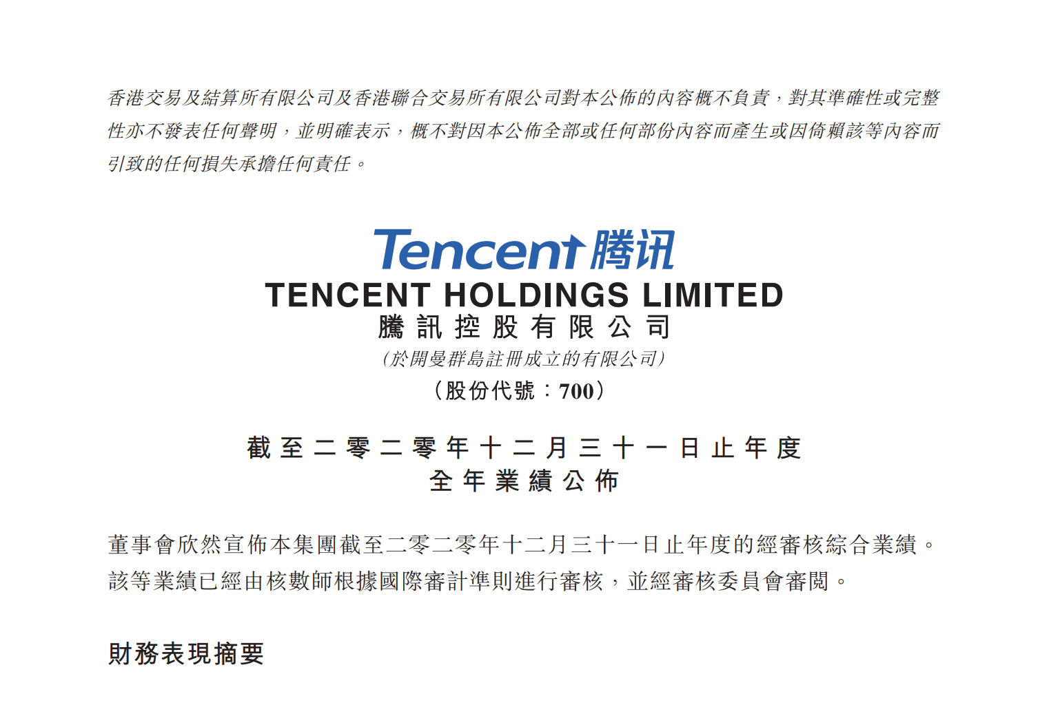 3月24日,腾讯发布2020年第四季度财报和全年业绩报告。这是经历2020年疫情大考后,腾讯交出的首份全年成绩单。