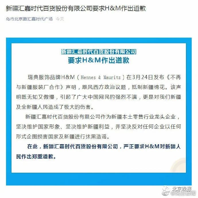 新疆汇嘉时代百货股份有限公司,严正要求H&M对新疆人民作出郑重道歉。