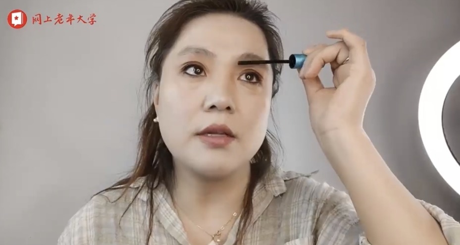 “这节课,我们讲一个眼妆的综合画法。注意太阳穴这个位置,因为过了四十岁,太阳穴非常容易塌陷,会显年龄大,就一定要打上亮色的高光。”网上老年大学个人形象设计课老师韩雪正在讲解眼妆画法。手机屏幕面前,老年学员石阳也拿着化妆笔,一步步跟着学。