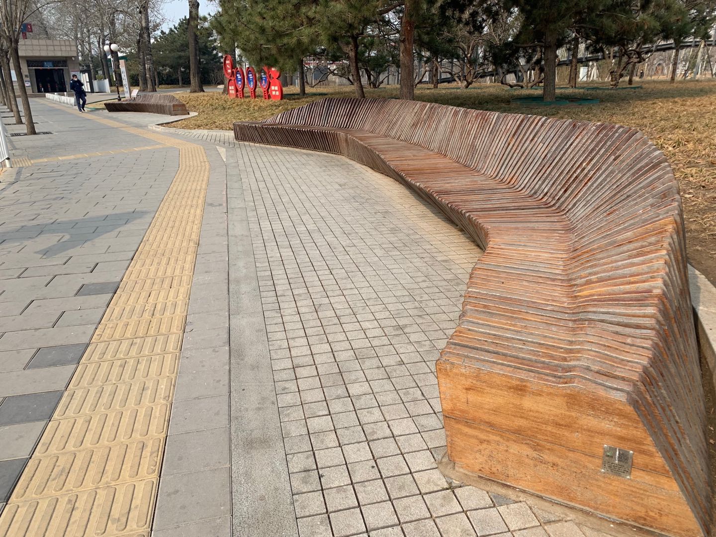 八宝山地铁站外的长椅,二维码脏污、缺损