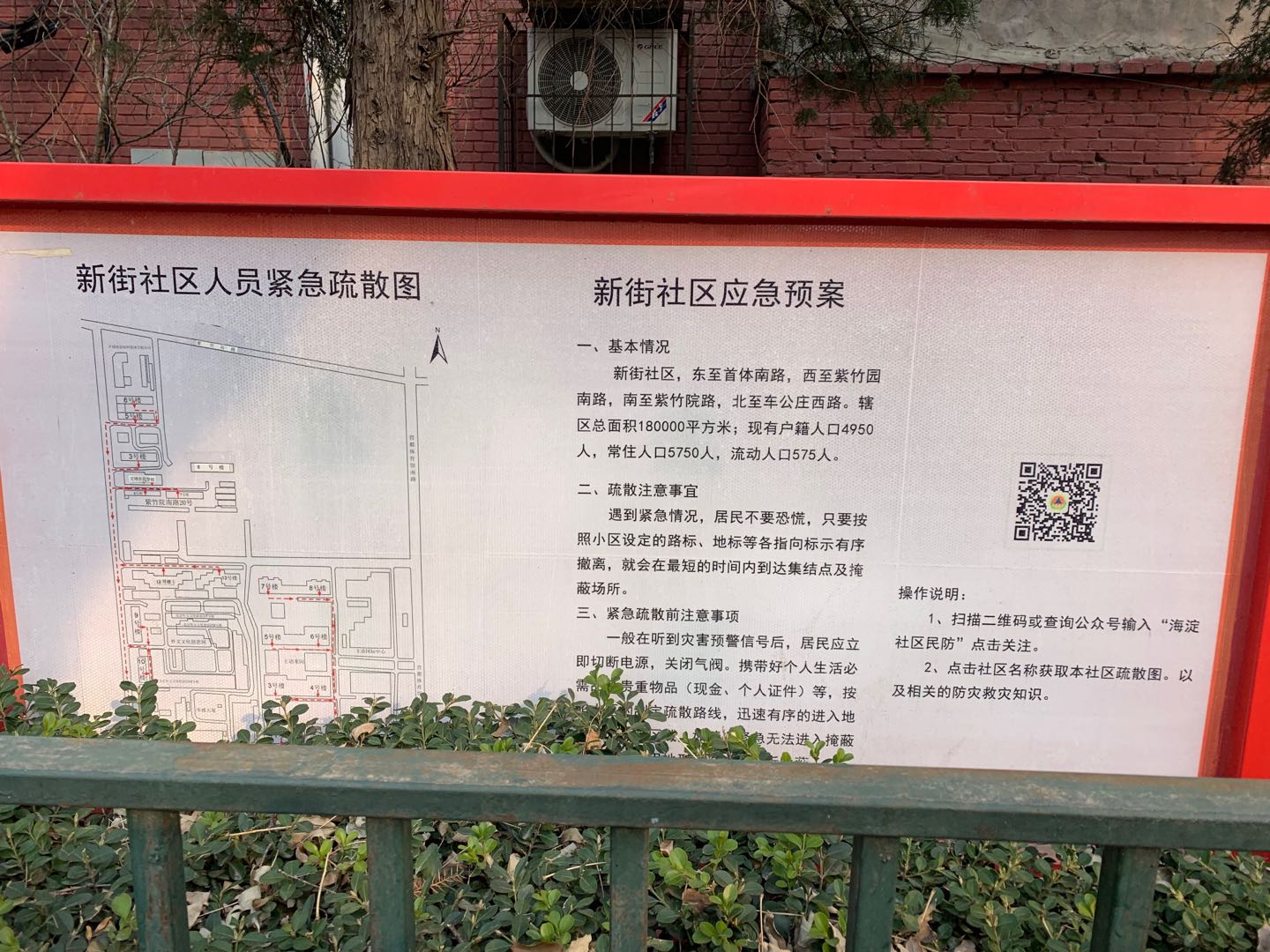 紫竹院南路的路侧的绿化隔离带内,立有一块社区应急预案公示背板,上面除了公示有社区人员紧急疏散图外,还公示了社区应急预案。为了便于社区居民了解详情,背板上印有醒目的二维码,提示居民们可以扫描二维码点击关注“海淀社区民防”的公众号,获取本社区疏散图及相关防灾救灾知识。记者随即掏出手机,对准二维码扫描,令人意外的事发生了,手机屏幕上显示“该账号已自主注销,停止使用”。而这一已不知失效了多久的二维码,如今依然被公示在路边,并未进行撤换。
