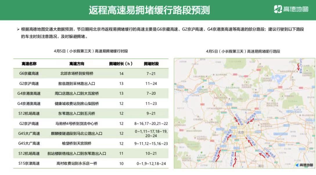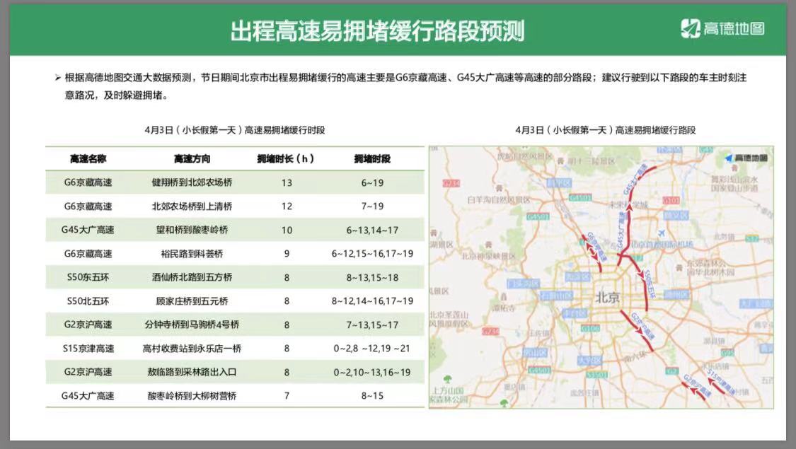 根据高德地图交通大数据预测,节日期间北京市出程易拥堵缓行的高速主要是G6京藏高速、G45大广高速等高速的部分路段。其中4月3日,G6京藏高速健翔桥到北郊农场桥路段拥堵时长或将达到13小时,拥堵时段为6点至19点;京藏高速北郊农场桥至上清桥拥堵时长或将达到12小时,拥堵时段为7点至19点。