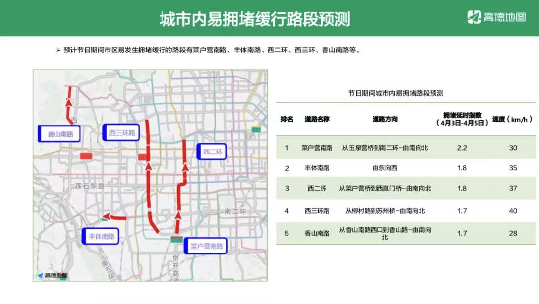 从城区来看,预计节日期间市区易发生拥堵缓行的路段有菜户营南路、丰体南路、西二环、西三环、香山南路等。在驾车出行热门景区方面,预计节日期间八达岭长城最受欢迎,其他排在前十位的热门景区依次是玉渊潭公园、古北水镇、北京植物园、南海子公园、北京西山国家森林公园、北京野生动物园、南宫五洲植物乐园、颐和园、北京动物园。