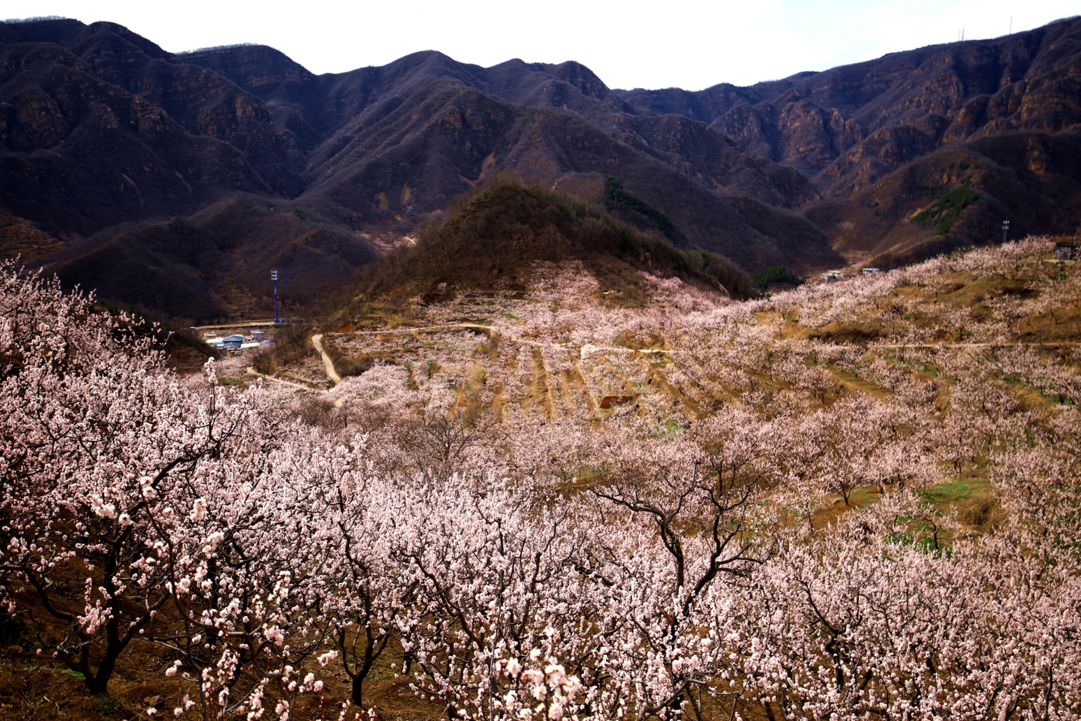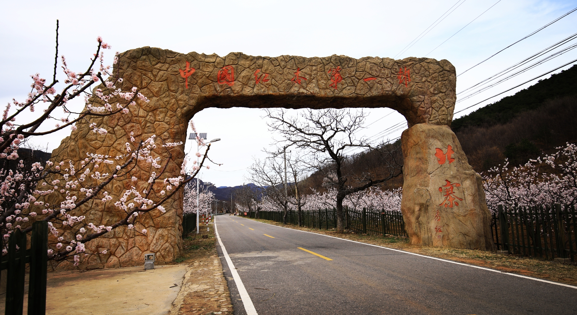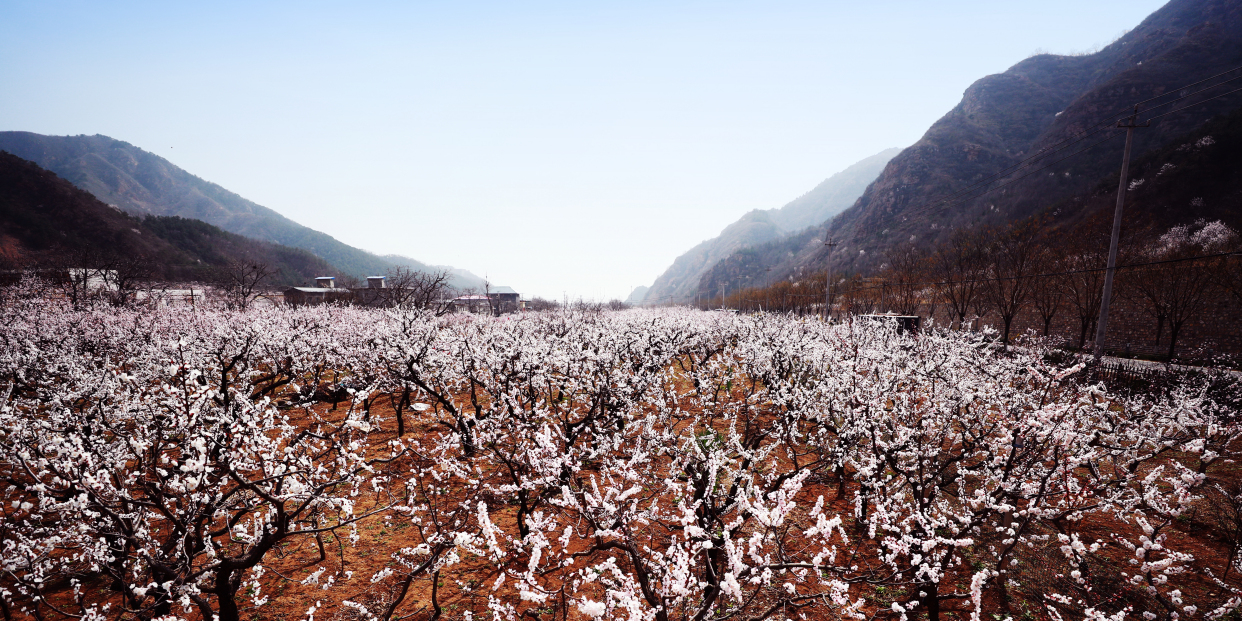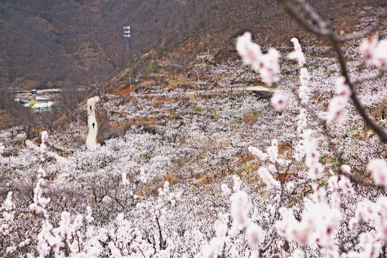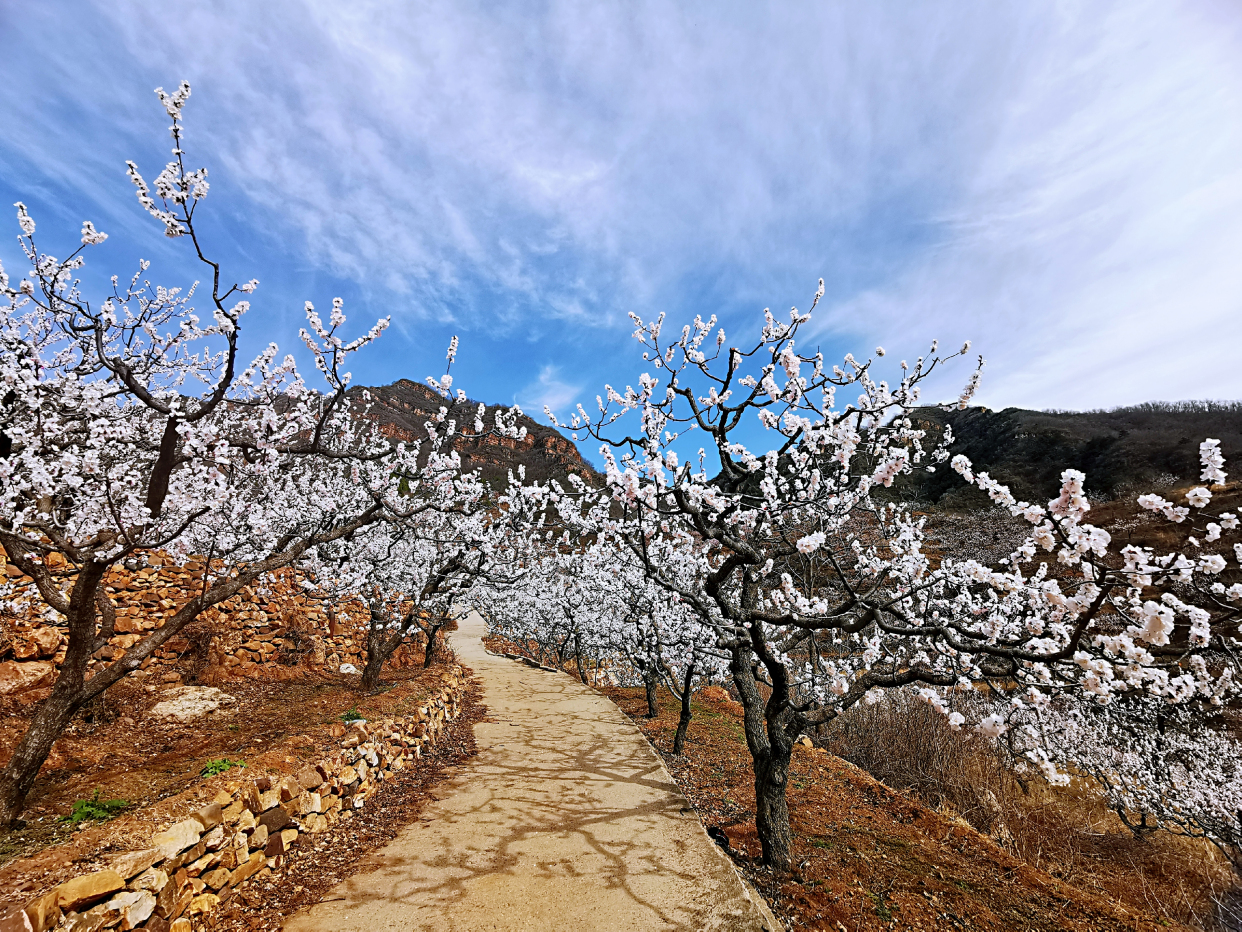 北寨村有中国红杏第一乡之美誉,现有红杏树近万亩,40多万株。每年的三月底至4月初,满眼如云似雪的白,千树万树的杏花,宛如世外桃源即现眼前。万物皆春意,枝头含苞待放的杏花儿,一串挨着一串,一朵接着一朵。远观只见白白粉粉、密密麻麻的一片,好似一张无形的花网笼罩在山野,茫茫无边,给小山村增添了无尽的活力。