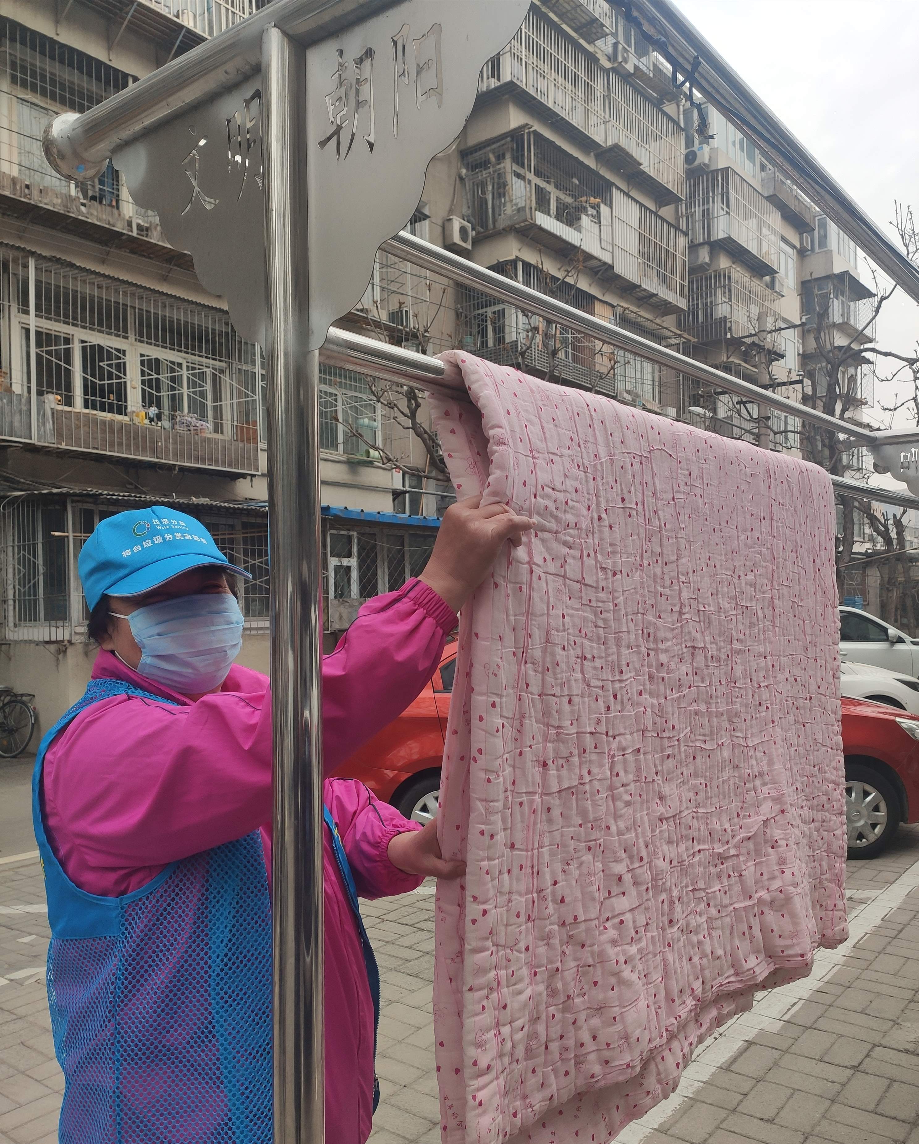 家住顺义区天竺镇蓝天苑小区的李女士说,小区里有一个小广场,里面安装了几把长椅,前几天有人将被褥铺在长椅上晾晒,椅子全部被占,既没法坐也不美观。她拨打了市民服务热线反映这一问题后,镇政府、社区居委会和物业公司的工作人员分别联系到她,告知已经劝说业主将被褥收走。