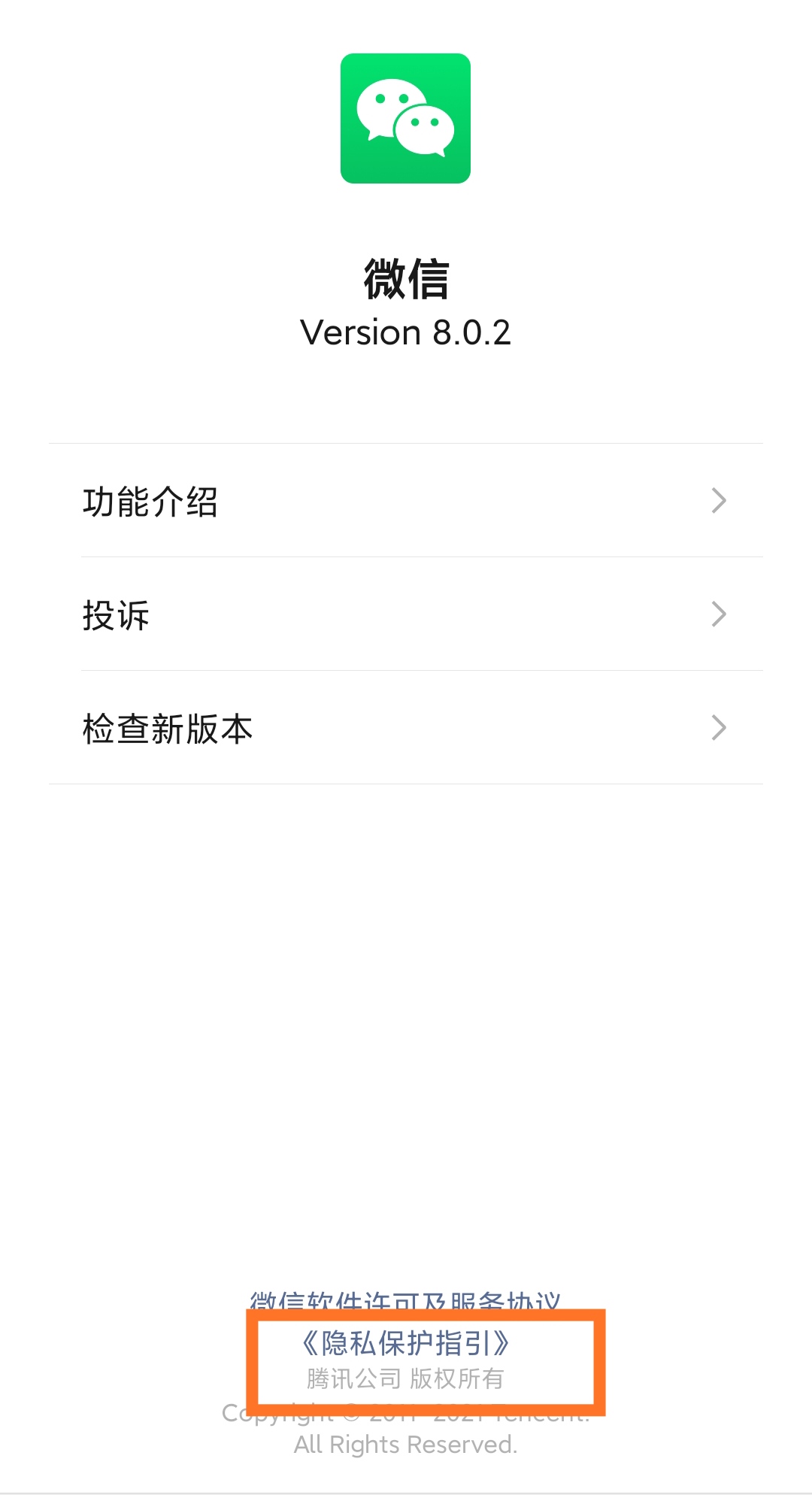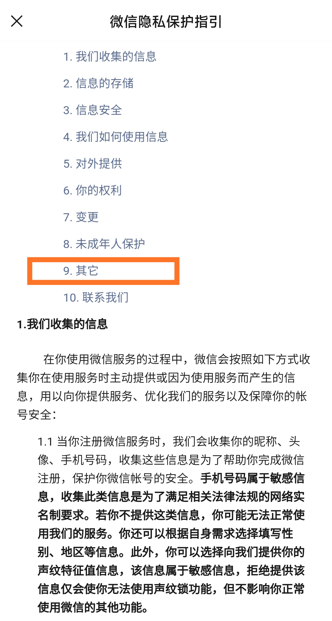 在页面底部,有微信的《隐私保护指引》,其中详细地写明了微信搜集的个人信息类型及其对应的用途、信息储存、用户权利、未成年人保护政策等内容。