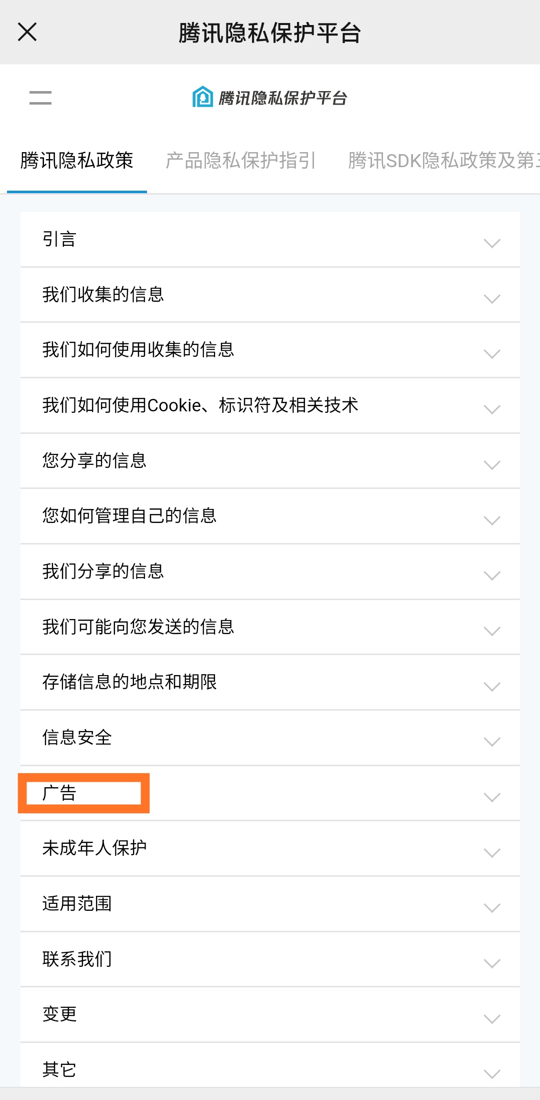 在该平台的“隐私政策”中,写明了腾讯广告的相关内容。
