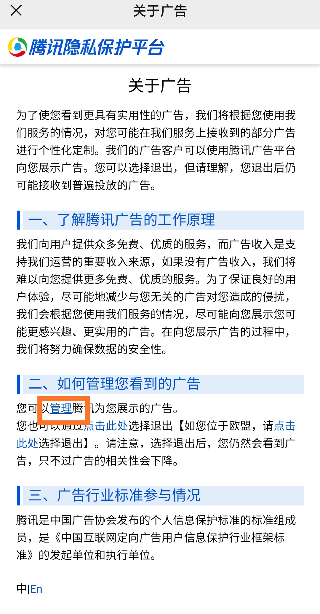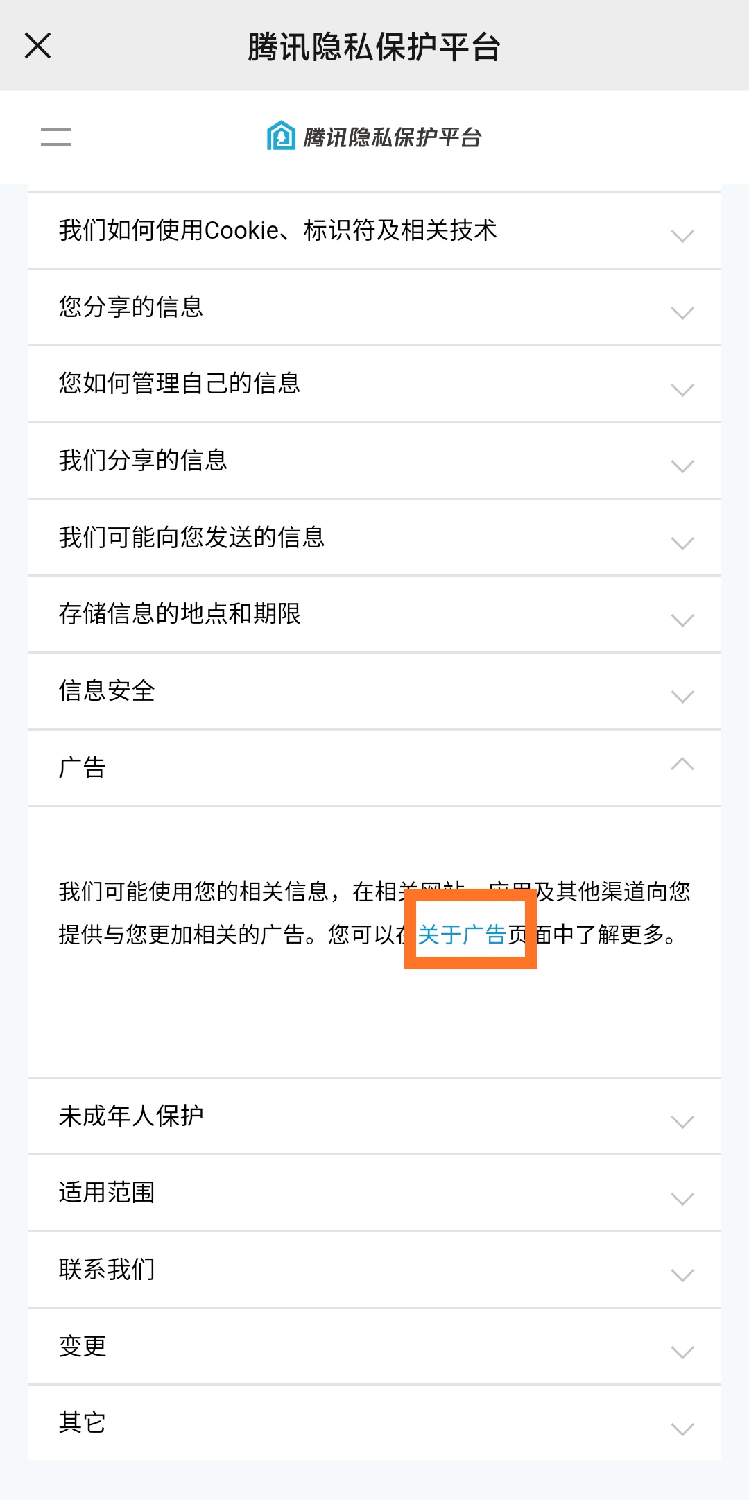 点击“关于广告”四个字。可以了解到腾讯广告的工作原理、如何管理看到的广告以及广告行业标准的参与情况。
