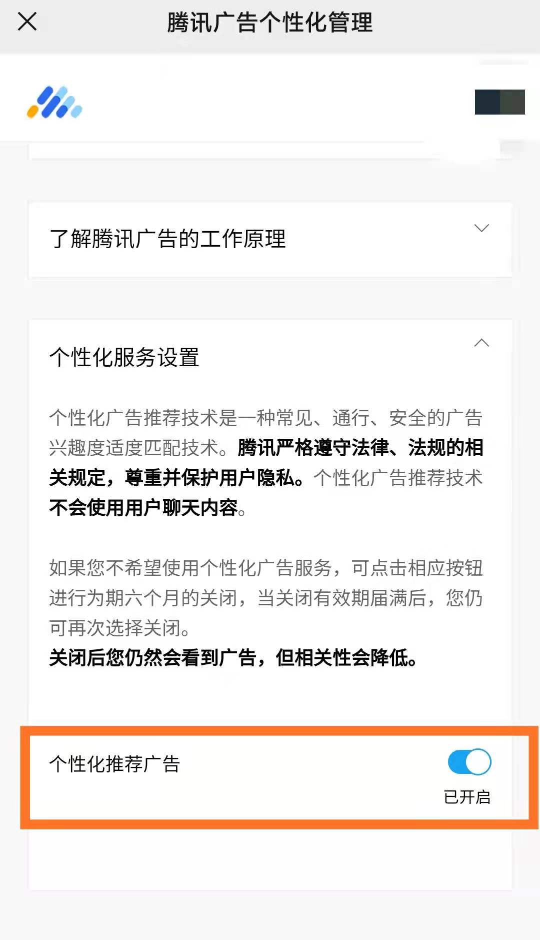 腾讯关于广告个性化管理条款表明,若开启了个性化推荐广告,腾讯方面可以将用户注册腾讯服务时所填写的信息或使用腾讯服务时产生的行为数据作为用户画像提供给广告商。但若用户不希望使用个性化广告服务,可点击相应按钮进行关闭,关闭的期限为6个月,关闭后用户仍会看到广告,但相关性会降低。6个月之后腾讯方面会再次自动开启个性化广告推荐,用户仍需自己手动关闭。