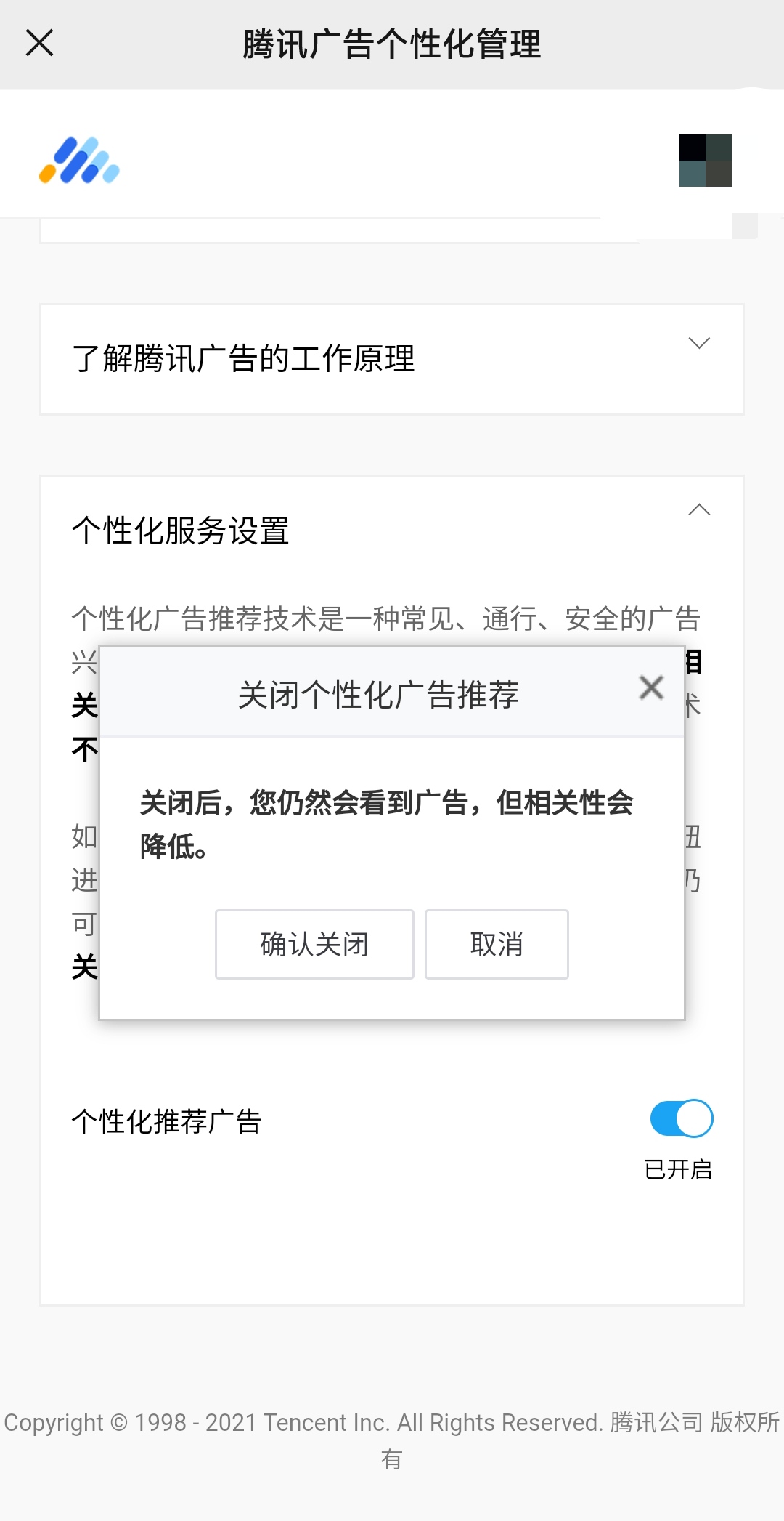 点击“管理”二字,即可进入腾讯广告的个性化管理页面。