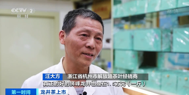 浙江省杭州市解放路茶叶经销商 汪大方:去年是1.5万元左右一斤,真正的好的狮峰龙井在1.5万元一斤,今年也是在1.5万元一斤,西湖龙井跟去年差不多,标价3800元一斤,卖就3000元左右一斤。
