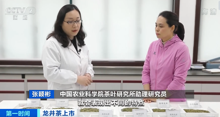 在中国农业科学院茶叶研究所,张博士为记者准备了一些比对样本,分别是一级产区的狮、龙、云、梅四个字号和二级产区的龙。同样是西湖龙井,从颜色、外观上就有很大的差异。