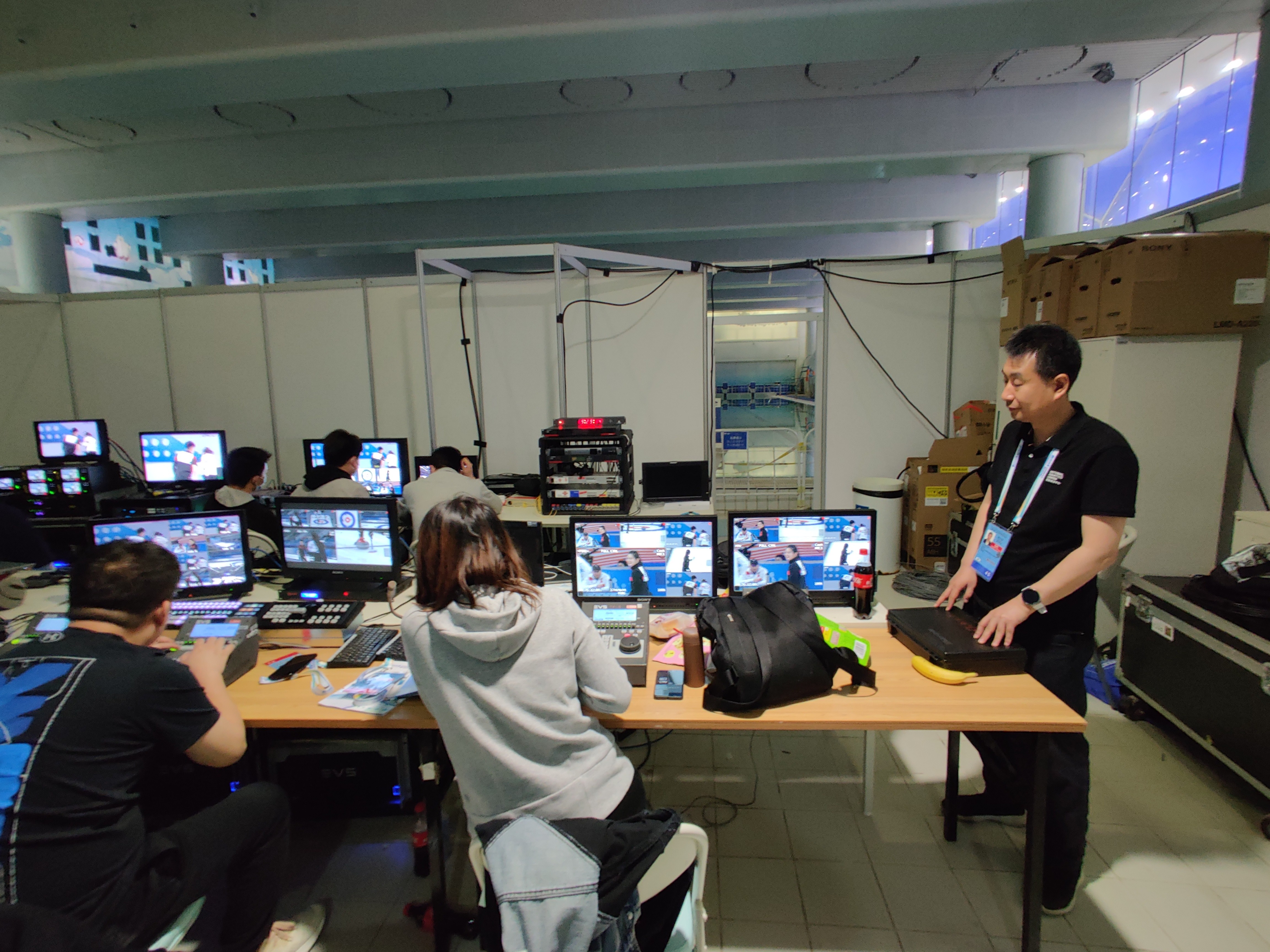 由于这次测试活动冰壶比赛的转播工作准备时间比较紧张,田鸿涛过去一周多连续加班加点,从导播间选址、搭建,转播车入场线路,到摄像机位选择,忙得四脚朝天,谈起自己的付出,他只是淡淡地说:“确实有压力,但也谈不上付出了特别多,和央视转播团队的配合很默契,大家一起把事情做好了。”