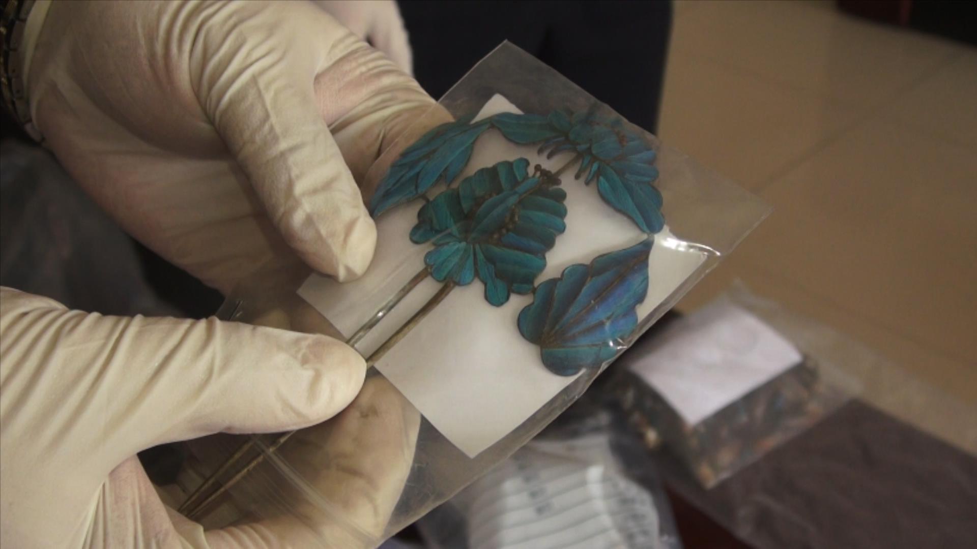 从王某的随身行李箱中,民警找到了88件饰品。随后,民警又在王某家中起获了多支翠鸟的标本及几公斤的翠鸟羽毛。经过专业部门鉴定,88件饰品中,百分之九十以上为点翠饰品。