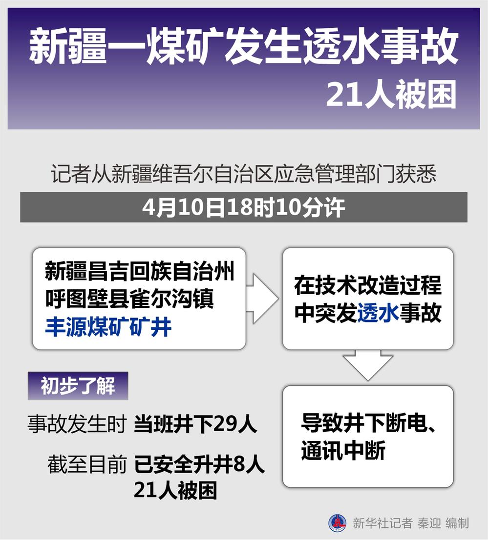 4月10日18时10分许,新疆昌吉州呼图壁县雀尔沟镇丰源煤矿矿井在技术改造过程中,突发透水事故,导致井下断电、通讯中断。初步了解,事故发生时当班井下29人,已安全升井8人,21人被困。