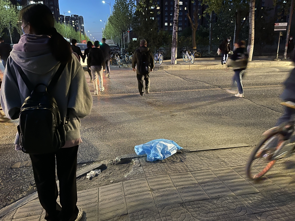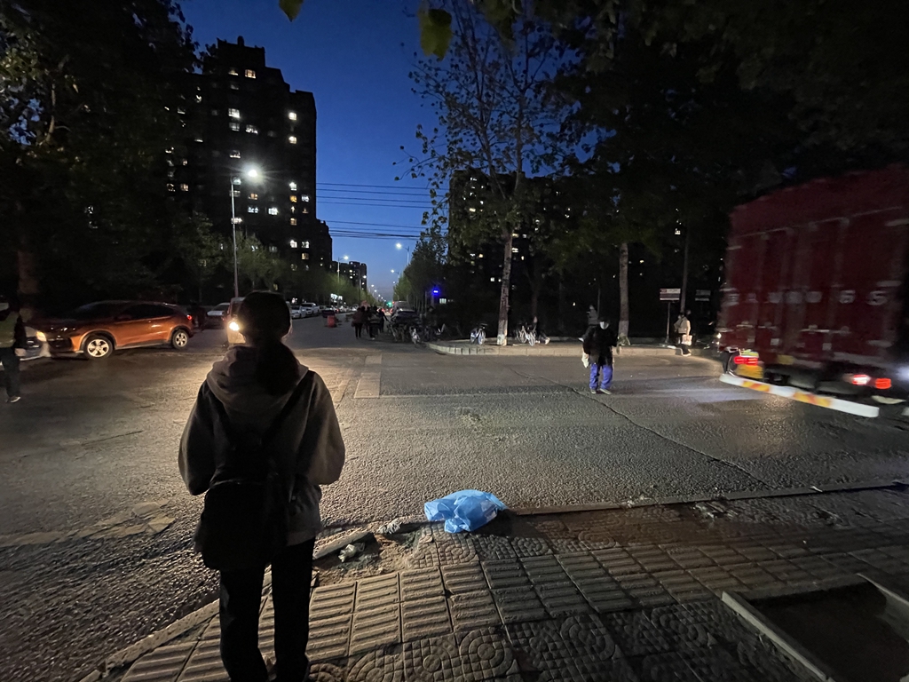 当晚7时记者赶到现场时,道路已经恢复畅通,事故车辆和被撞者已被移走,现场的地面上还能依稀看到血迹。事故现场为一处小型十字路口,道路南北各有一个小区。此时正值下班高峰,私家车、公交车和大货车在定泗路上往来行驶。为了缓解拥堵,一位协管员正站在事故现场疏导交通。