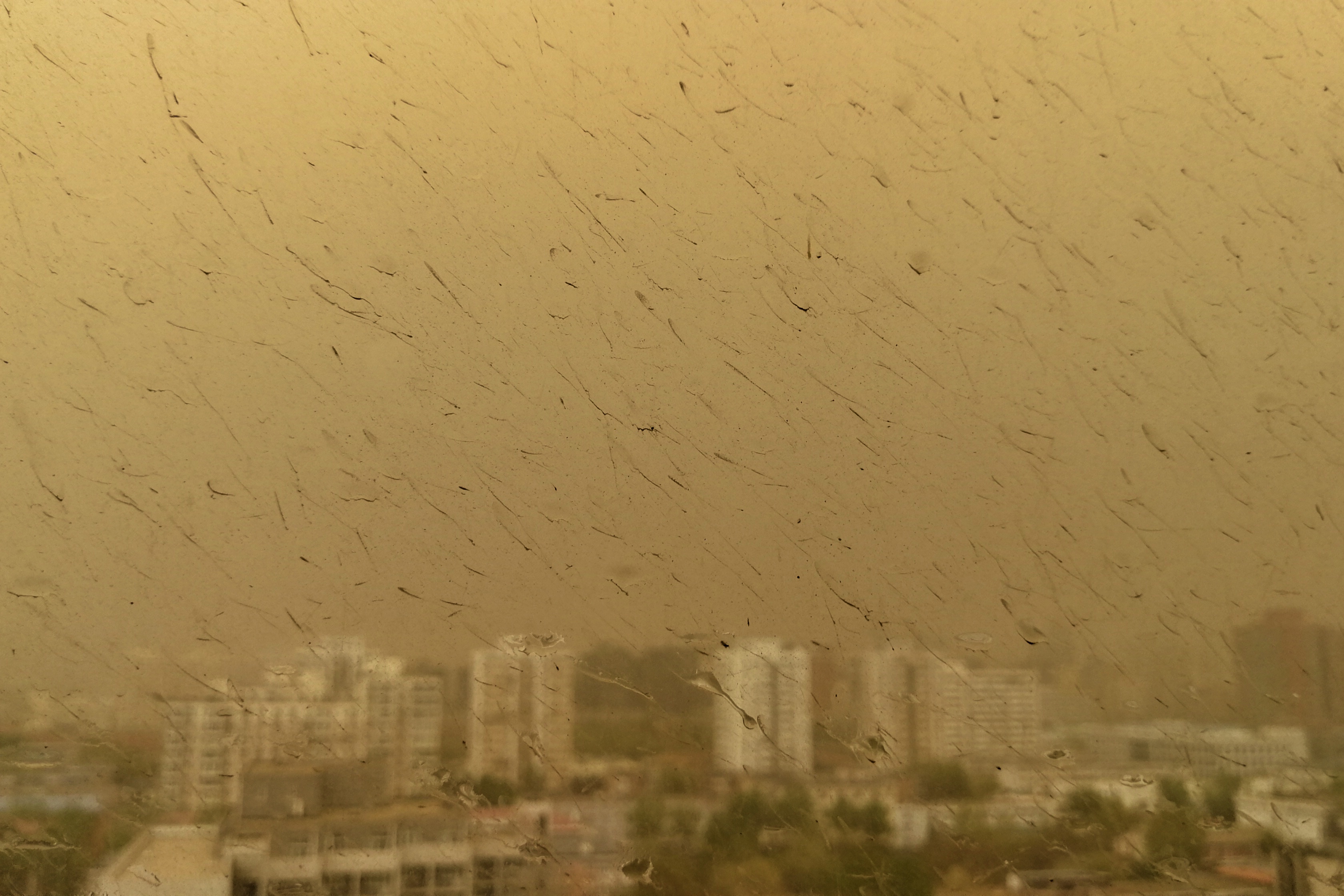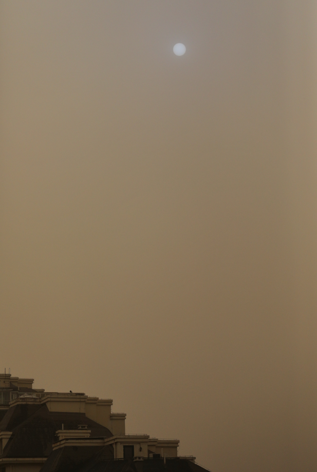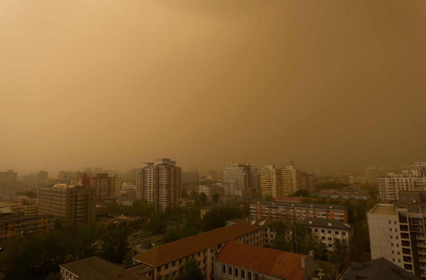 今天下午(4月15日),大风、沙尘、雷雨天气同时影响北京。因阳光穿过沙尘发生散射现象,太阳也呈现出微微的蓝色。
