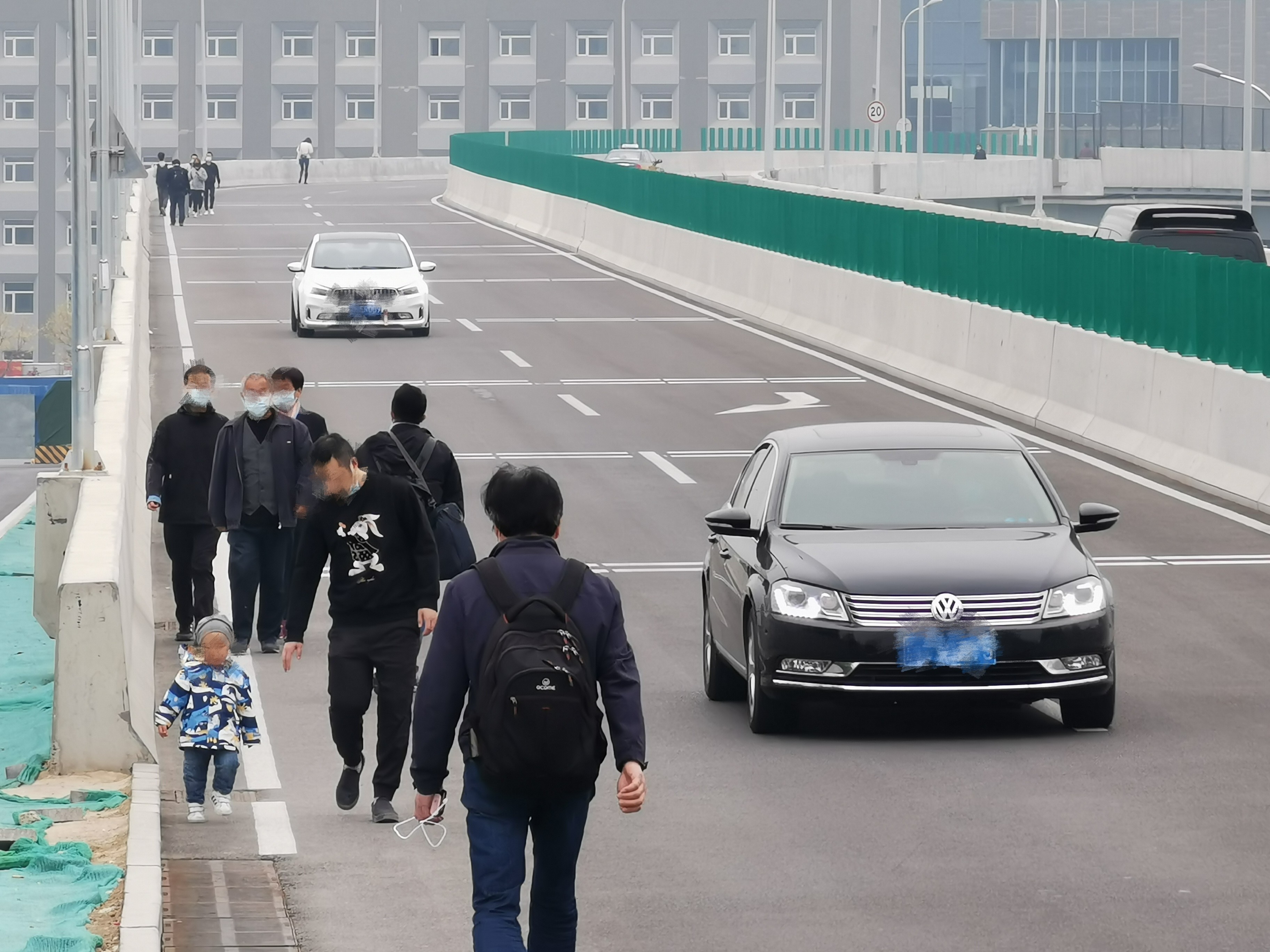 虽然此时高架桥上机动车来往不断,桥的起点处还竖立着“禁止行人通行”的交通标识,但在看到其他人陆续上桥并确认了手机导航后,这波乘客也拎着行李向高架桥进发。
