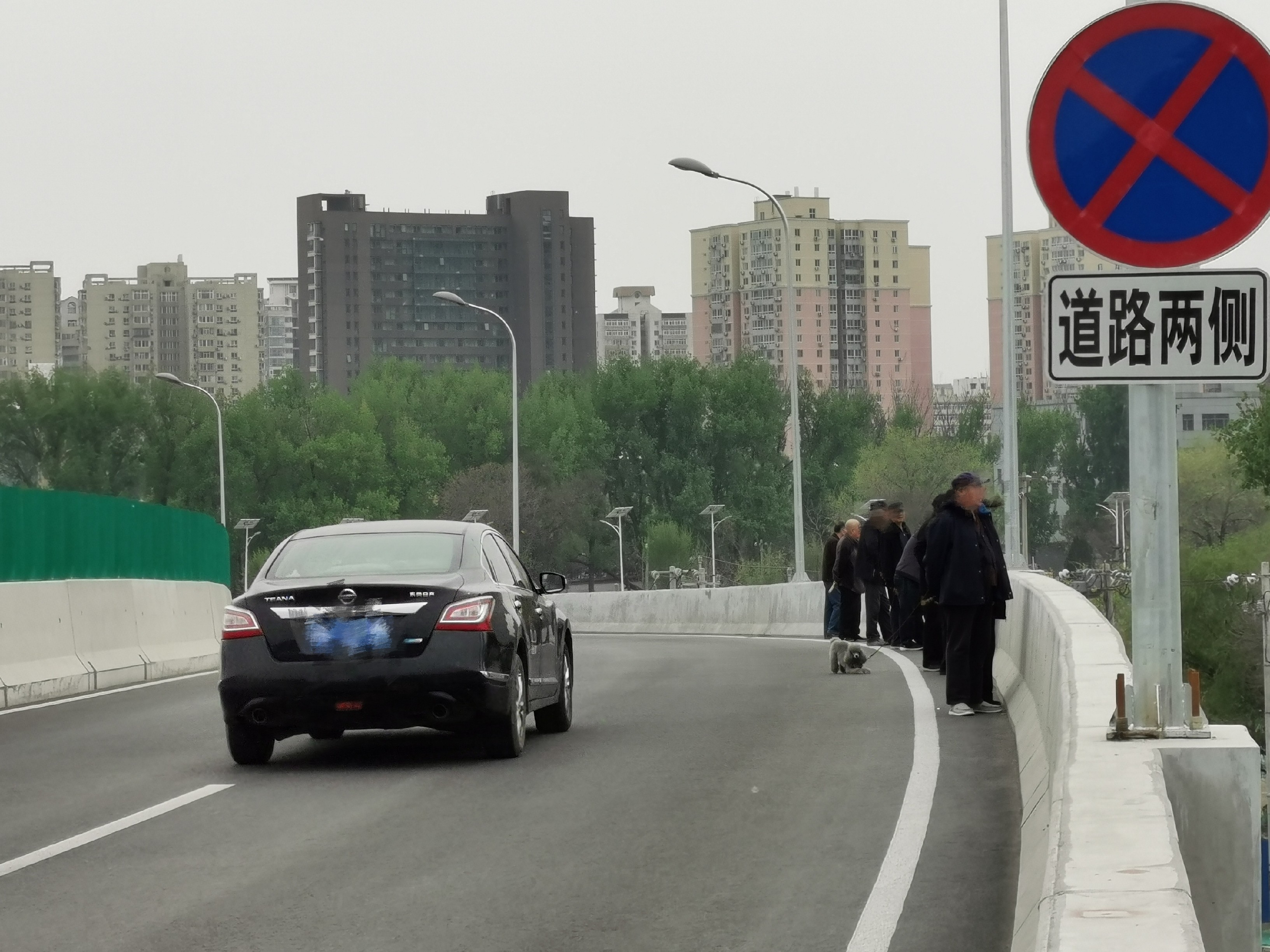 不仅如此,高架桥上除了进出站的乘客外,还可以看到快递外卖车、电动三轮摩托以及周边居民的身影。一些居住在附近的人不单带着孩子和宠物来此散步,甚至还紧贴着不到半人高的护栏眺望朝阳站,让人看得胆战心惊。