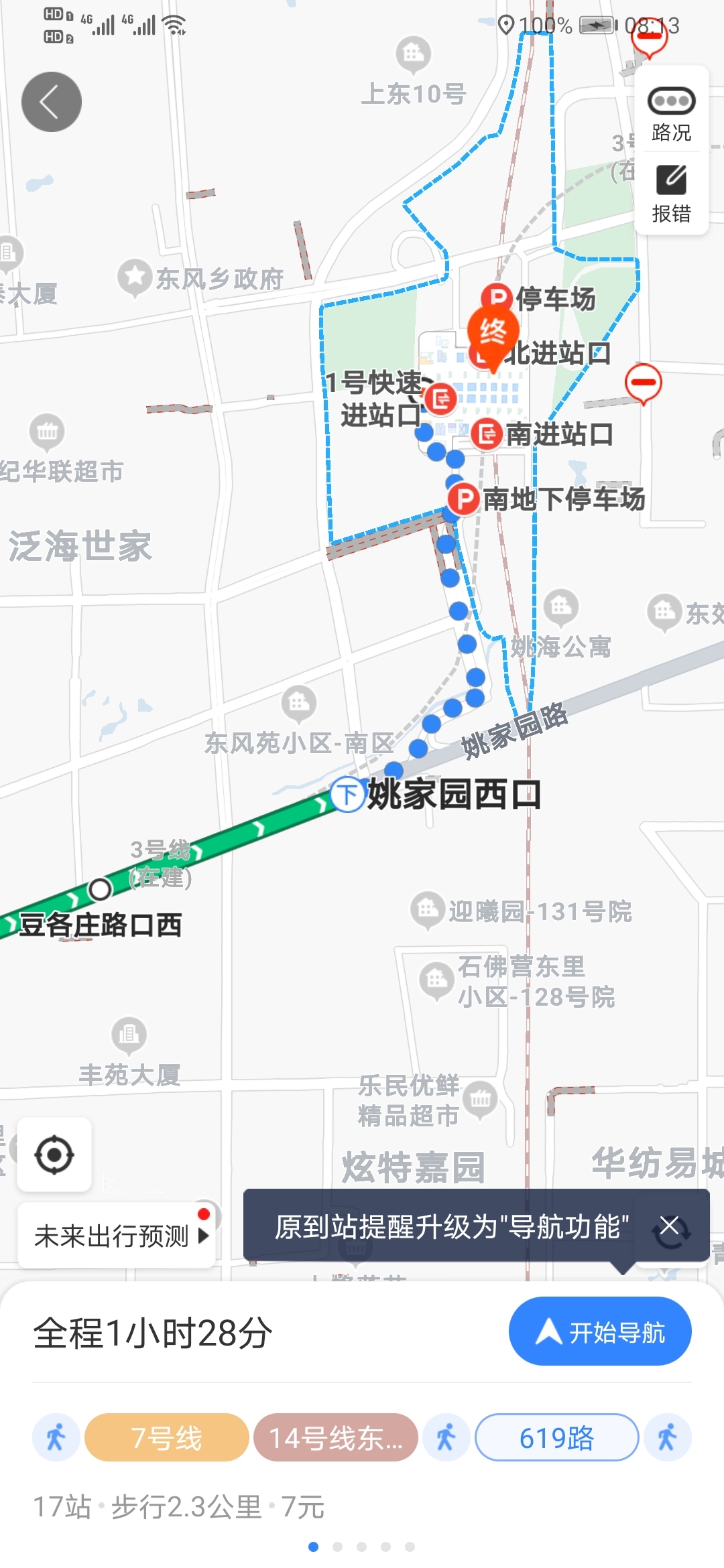 记者打开多款导航软件发现,当乘客起点位于北京朝阳站东侧或北侧区域时,导航会正确地把乘客引向北京朝阳站的东广场处。但是,当乘客想要从西侧或南侧进站的话,导航默认的下车地点则多为姚家园西口公交站,然后步行线路就会显示为经高架桥进站。