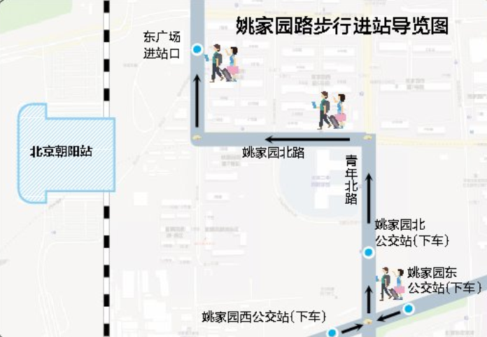(目前,乘客需要从姚家园路沿线乘坐公共交通前往北京朝阳站时,可按上图线路步行进站。)