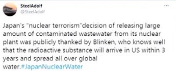 △“布林肯居然公开感谢日本将大量核废水排入大海的‘核恐怖主义’决定,他明明深知放射性物质将在三年内影响到美国,并在全球水域扩散。”