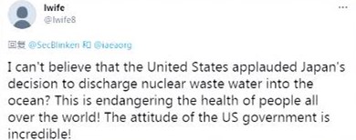 △“美国居然赞扬日本将核废水排入大海的决定?这会危害全世界人民的健康!美国政府的态度简直让人难以置信!”