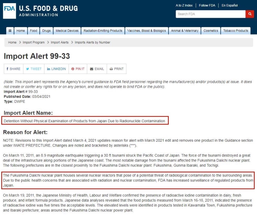 事实上,美国早就给自己开好了“后门”:就在上个月,美国食品药品监督管理局(FDA)发布的“进口警示”报告明确提出,由于放射性污染原因,相关部门应对日本产品进行扣留,而无需进行检查。