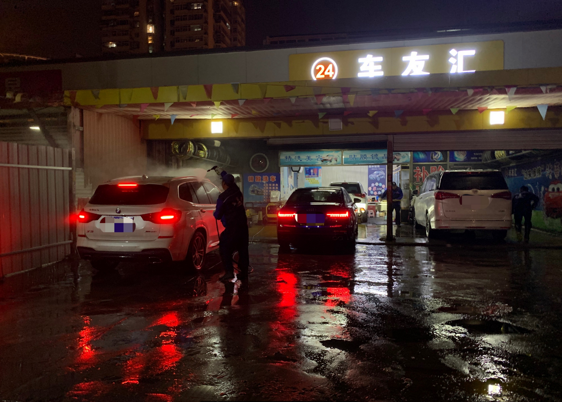 不到10分钟,一辆车清洗完毕开出洗车行,紧接着下一辆进入。直到晚上11时许,前来清洗的车仍络绎不绝,现场还有五六辆车在门外排队等待。