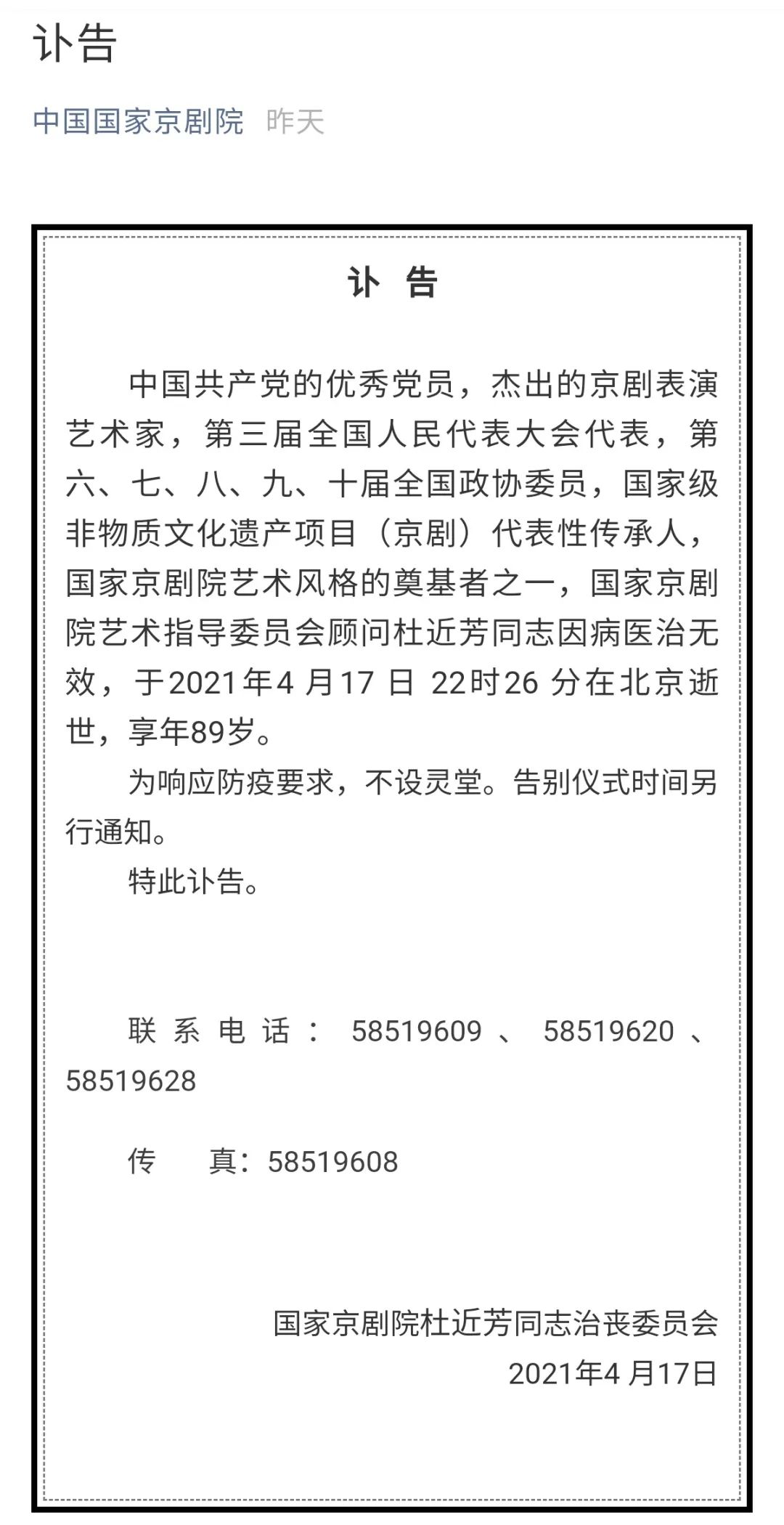 著名京剧表演艺术家、国家级非物质文化遗产项目(京剧)代表性传承人、国家京剧院艺术风格的奠基者之一、国家京剧院艺术指导委员会顾问杜近芳,因病医治无效,于2021年4月17日22时26分在北京逝世,享年89岁。