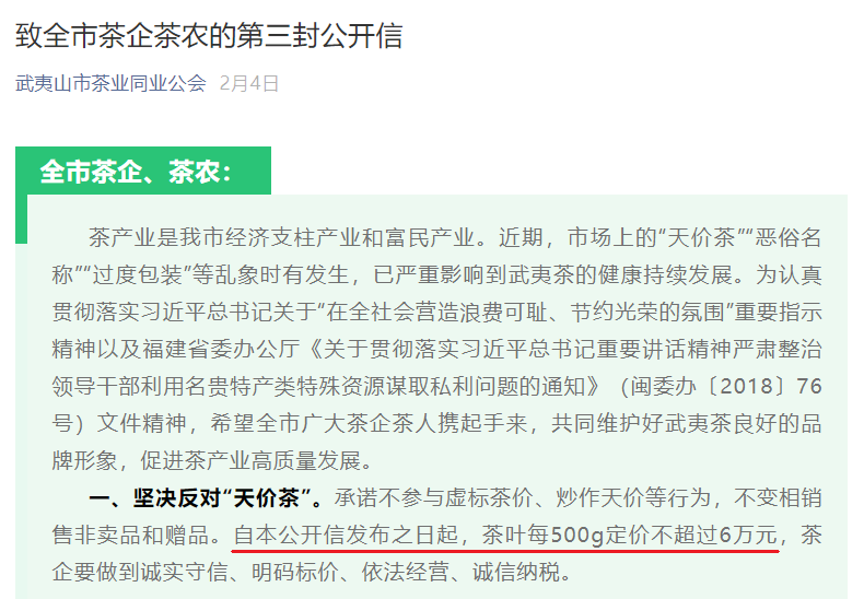 今年2月4日,武夷山市茶业同业公会发布公开信,呼吁“自本公开信发布之日起,茶叶每500克定价不超过6万元”,并表示坚决支持和配合为期三个月的集中专项整治行动。