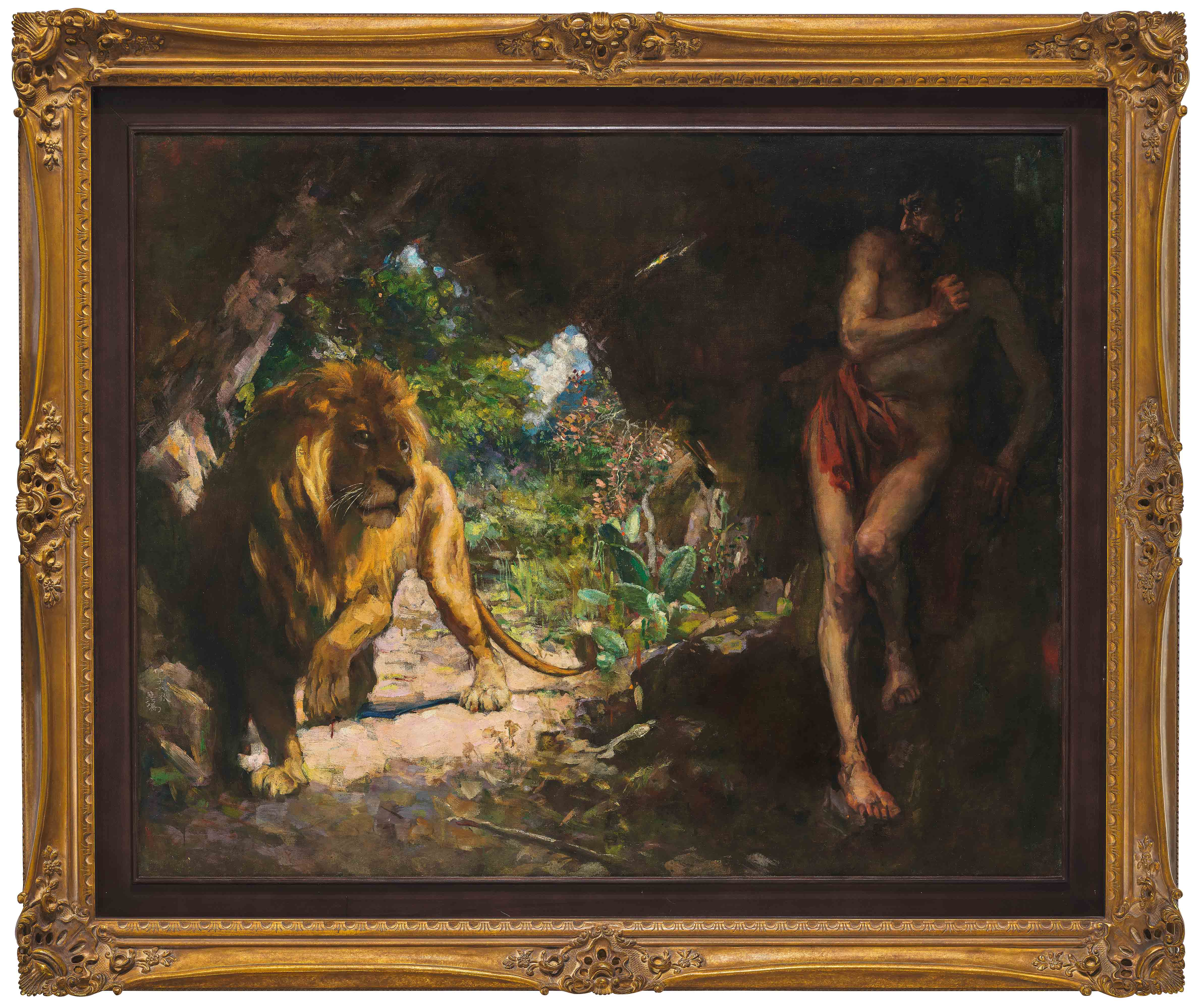 徐悲鸿的主题绘画作品数量稀少,目前在市场上只出现过6幅,以这件《奴隶与狮》尺幅最大。《奴隶与狮》标志着徐悲鸿艺术生涯的第一个创作高峰,是其最具重要性与代表性的名作之一,后继的《田横五百士》《徯我后》《愚公移山》等诸多来源于神话、寓言故事的主题油画,皆受《奴隶与狮》的开创性启发。