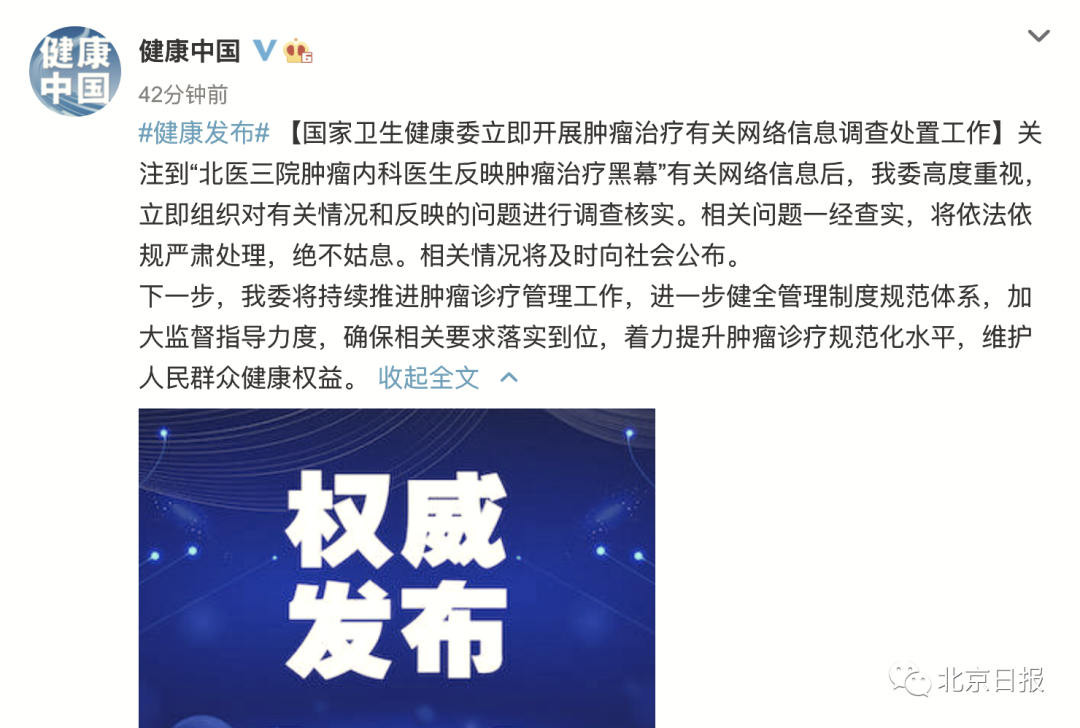 针对“北医三院医生反映肿瘤治疗黑幕”一事,国家卫健委有了回应。