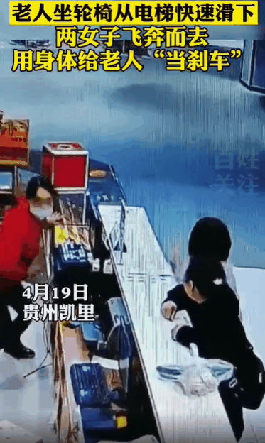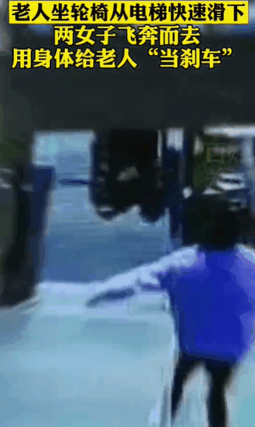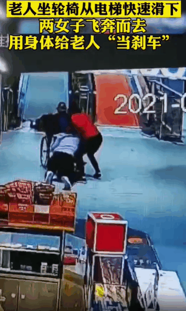 就在这危险时刻,紫色上衣的女子用身体挡在了轮椅前,但是因为冲击力量很大,紫衣女子还被轮椅推着前进了一段距离后,才停了下来,同时红衣女子也赶紧上前一把扶住了他们。