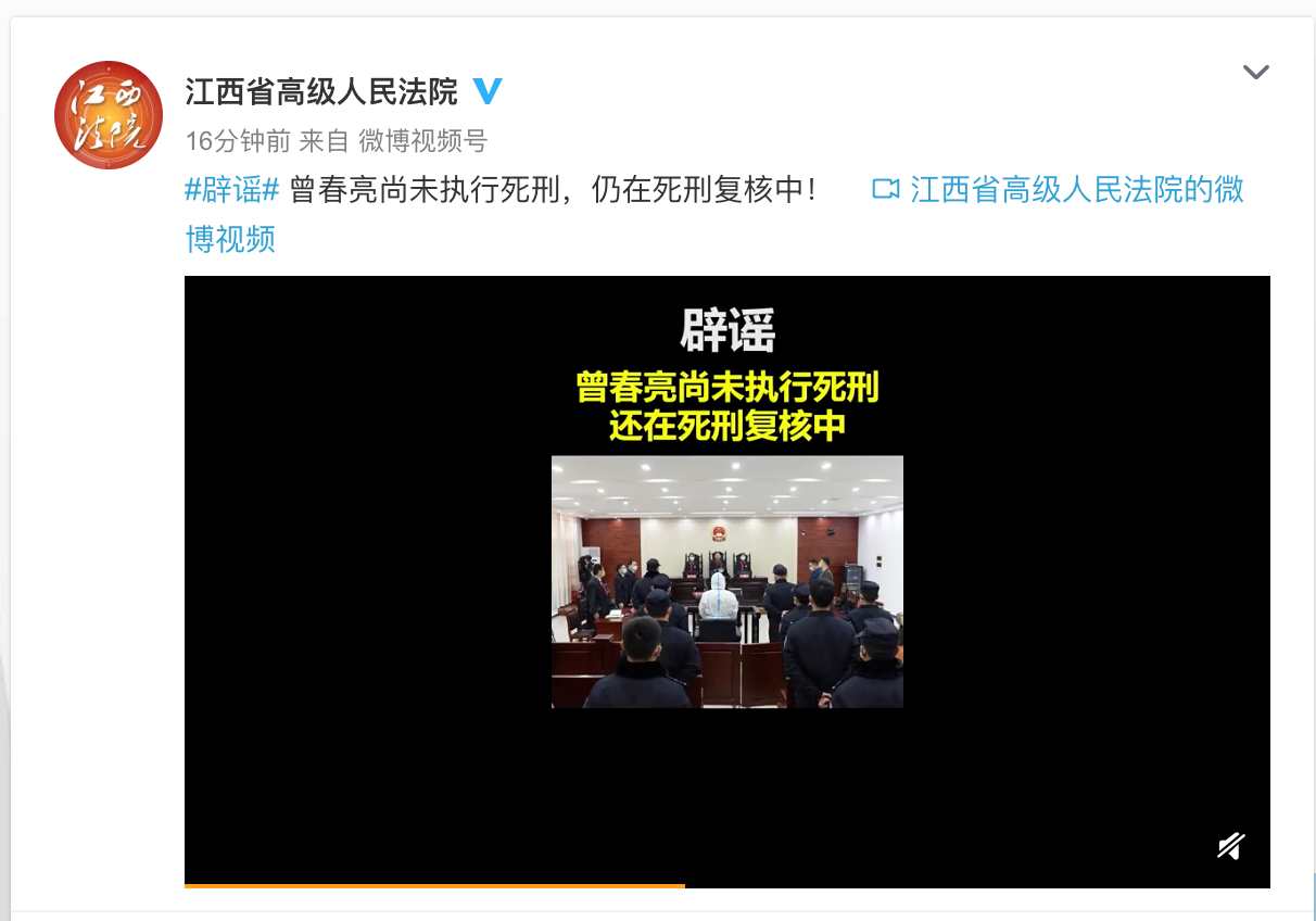 @江西省高级人民法院 20日发布消息:曾春亮尚未执行死刑,仍在死刑复核中!
